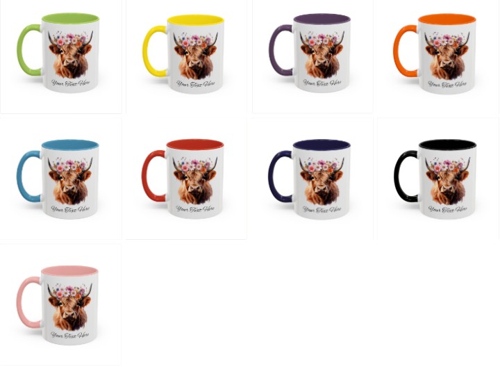 This ceramic accent mug brings a touch of countryside charm to everyday coffee and tea moments. A watercolor-style Highland cow, crowned with a ring of wildflowers, faces forward with gentle, expressive eyes. The colored interior and handle create a striking contrast against the glossy white exterior, making the artwork pop and giving each sip a cheery, curated feel. Lightweight but sturdy, it holds 11oz of your favorite brew and stands up to daily use—microwave- and dishwasher-safe for easy mornings. The design fits into relaxed farmhouse kitchens, studio desks, or garden-table breakfasts, and can be personalized with a short line of text beneath the portrait to make it feel like it was made just for you.