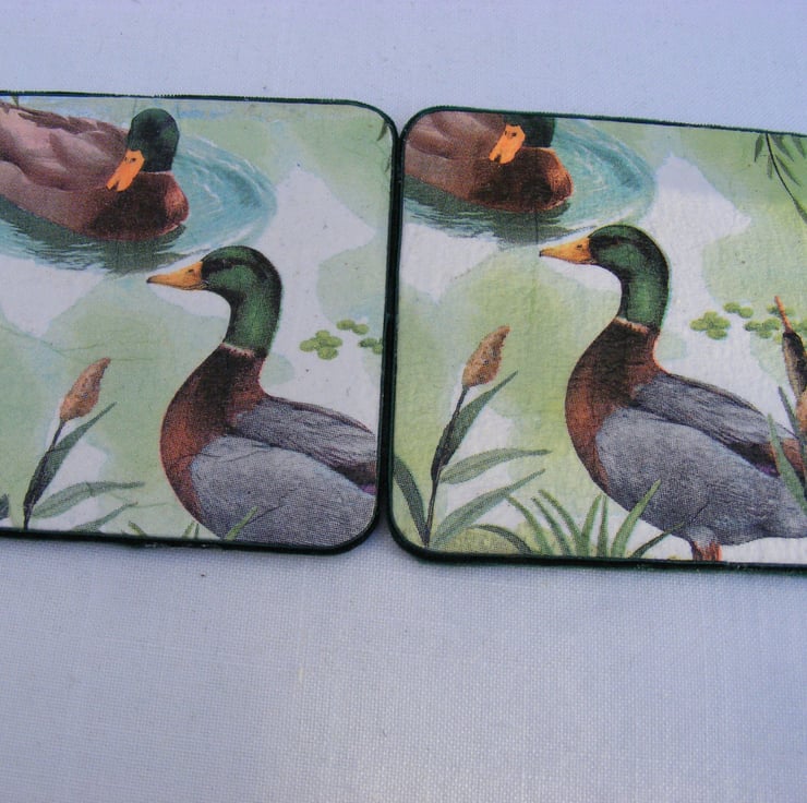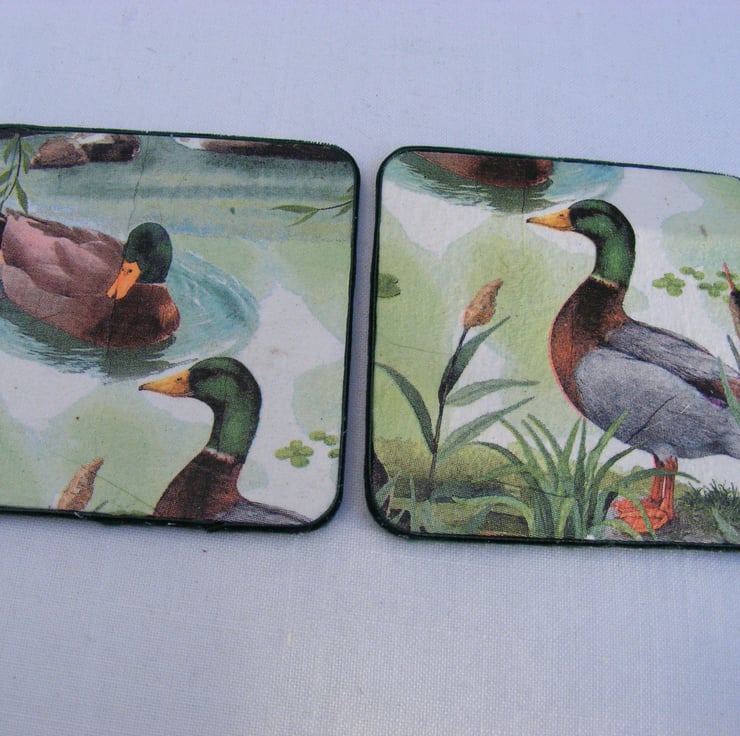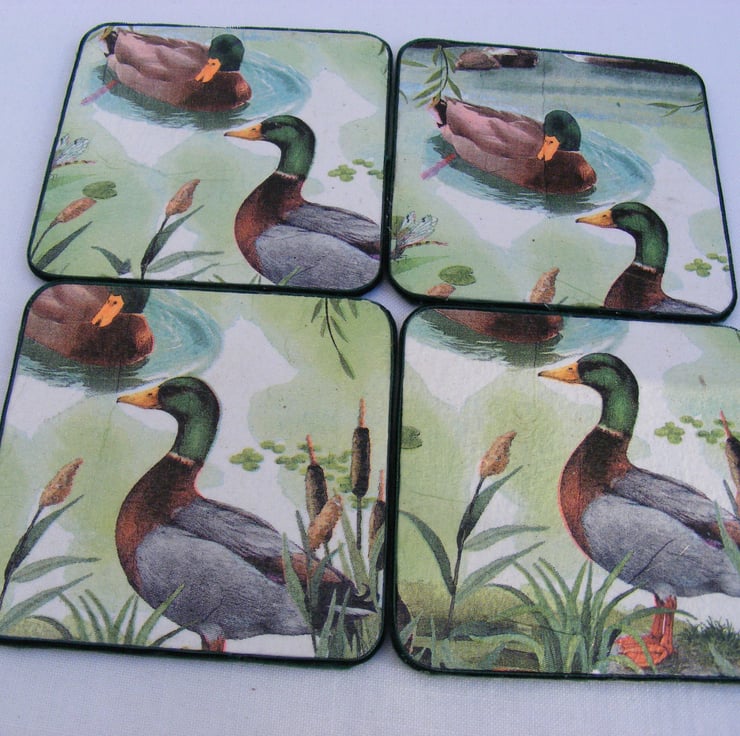 This set of 4 wooden coasters have been decoupaged with mallard duck napkins and varnished 3 times for durability. Sides of coasters have velvet ribbon attached and felt on the underside.
