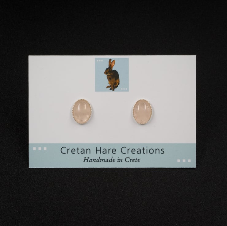 8x6mm oval delicate pale pink smooth rose quartz cabochon stones are mounted into a solid sterling silver mill edged mount with a butterfly clip to secure,