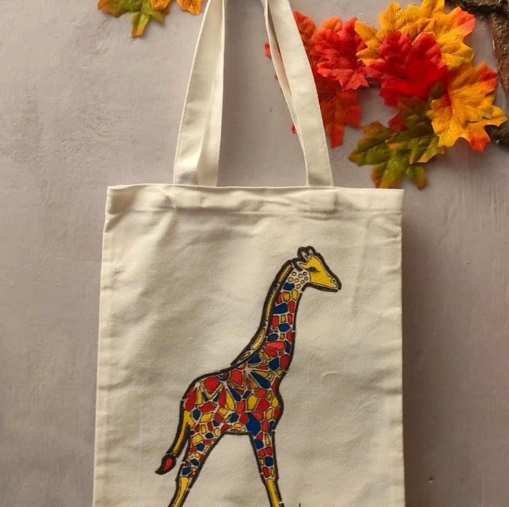 Tall Order Mosaic Giraffe Tote Shopping Bag – Hand Painted Upcycled Canvas Bag 31 x 36 cm