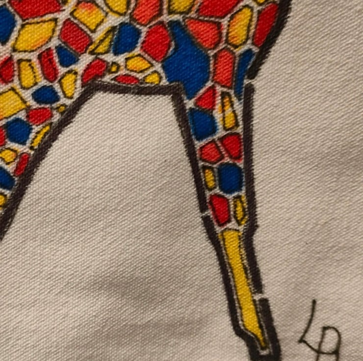 This tote is a 'tall order' in the best way possible. The bag was in As New Condition and had never been used. It was upcycled by a by me with a bright, mosaic-style giraffe, it’s bold, colourful, and completely unique. The front features the giraffe artwork, while the back is plain natural canvas.