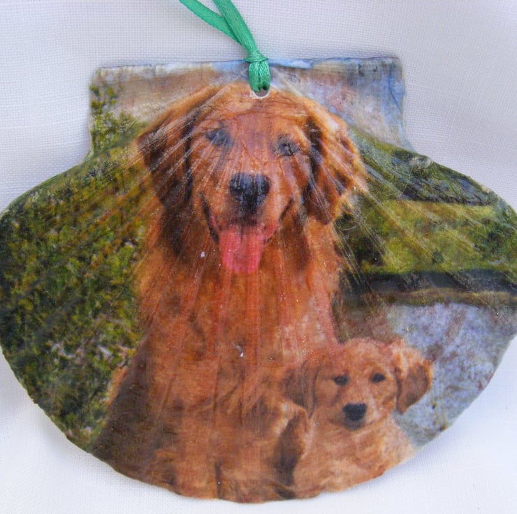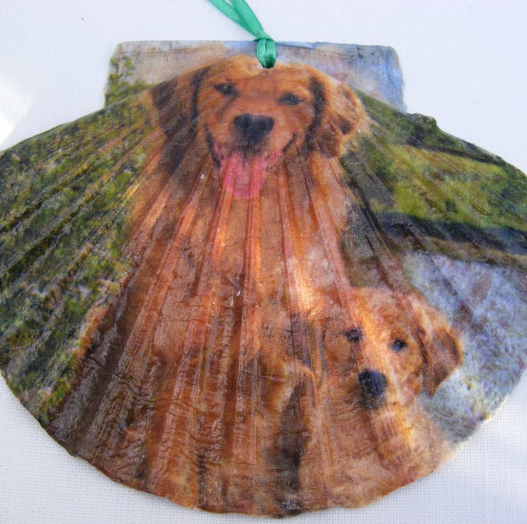 This lovely golden retriever scallop shell has been decoupaged with a lovely retriever napkin. Decoration has been varnished twice. I've attached a ribbon for hanging.