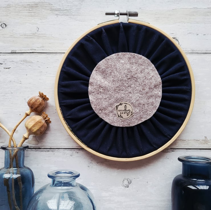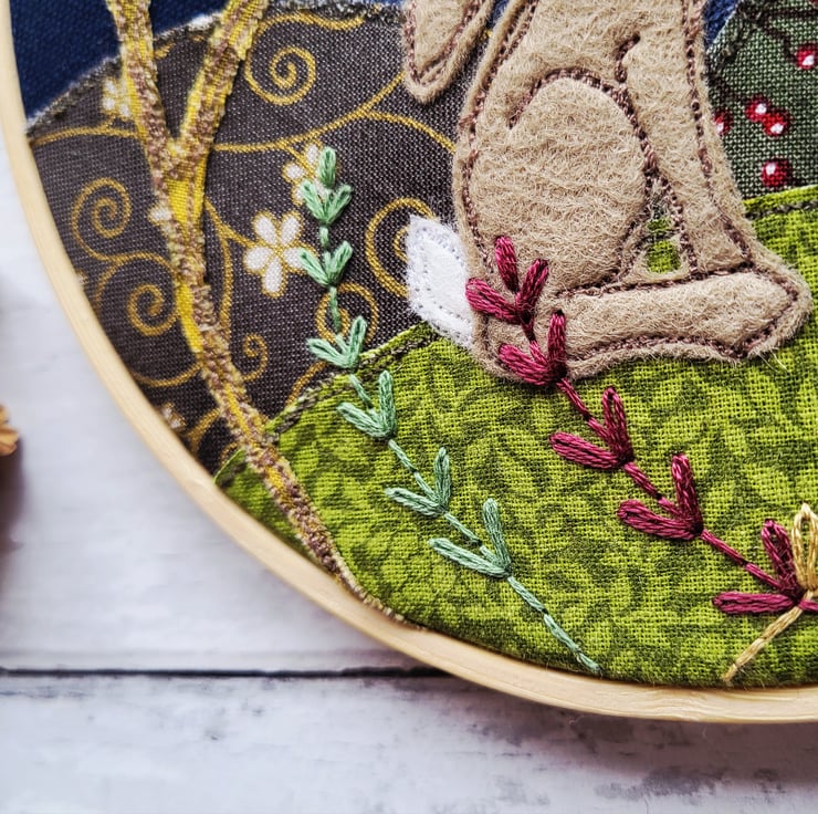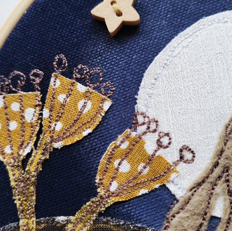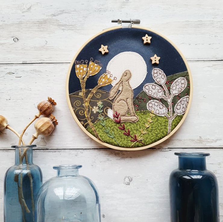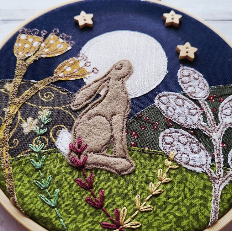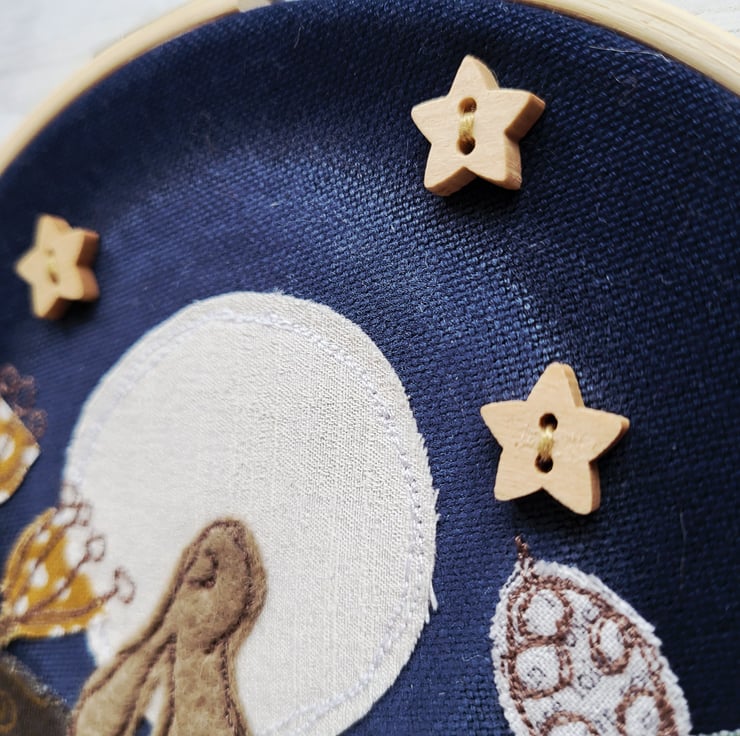 Freemotion sewn appliqued fabric moongazing hares finished with hand embroidered leaves and wooden buttons for stars. Mounted onto a 16cm wooden hoop.