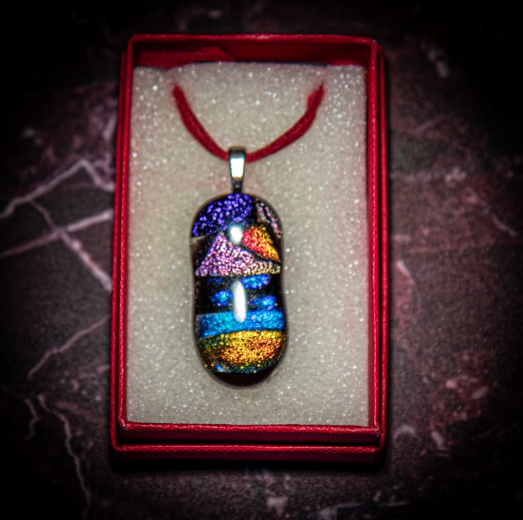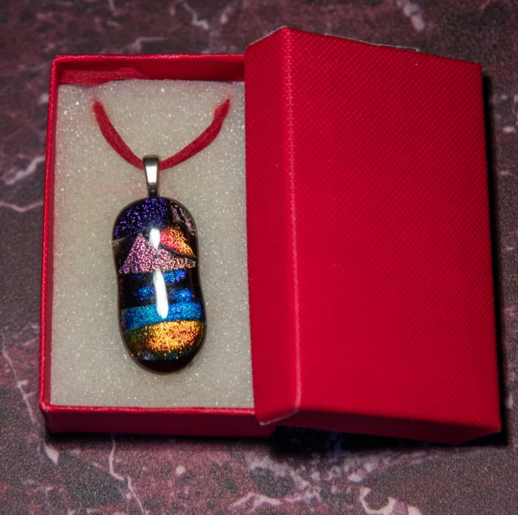 Hand made dichroic fused glass pendant on suede cord in red presentation box