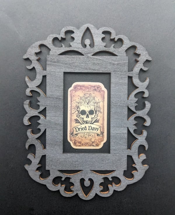 Vintage Apothecary Aesthetic: Features a detailed skull illustration entwined with spiderwebs, set above a "Dried Davy" scroll on an aged, parchment-style background.