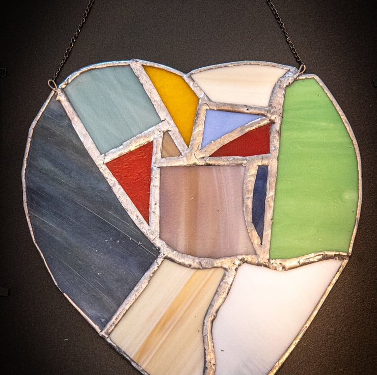 Looking through my glass off cuts one day I had the bright idea that I might be able to piece together a light-catcher. After an hour or so I pieced together something roughly heart shaped, which needed only minimum re-cutting and sanding to allow for soldering together using the copper foil technique. Hope you like it!