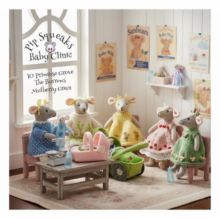 A teeny tiny pink layette set made specially to fit the baby Pip Squeaks. The set comprises a little cardigan with the tiniest buttons you ever did see, a matching bonnet with little holes for the Pip Squeaks ears and a little fleece play mat, decorated with a little daisy.