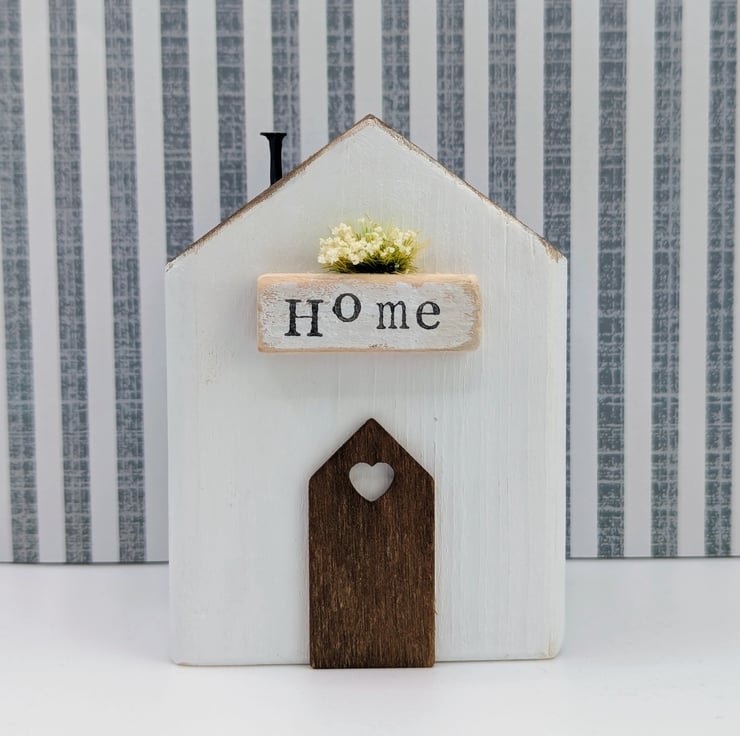 This stand alone cottage is painted white with the word 'Home' ink stamped by hand on a wood piece on the front and topped with white flowers.