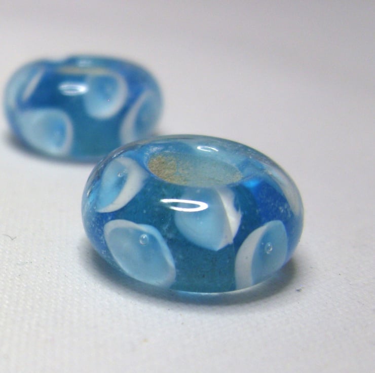 The beads are a pale blue in colour with white circular design. they measure approx 15 mm in diameter and are approx 5 mm wide. The central drill hole is approx 5 mm in diameter.