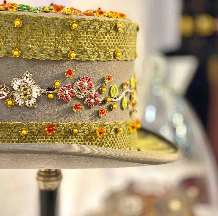 A band of ecclesiastical metallic and gold and green braid was pin stuck at the top and bottom of the vertical sides of this grey top hat. The same braid was pleated and applied to the rim. A decorative line of beaded trimming salvaged from vintage Indian saris was placed between the lines of these two bands. A sequined butterfly was pinned to the middle of the top of the hat and surrounded by more vintage Indian trimmings. It comes with it own original bespoke Lock & Co. cardboard box.