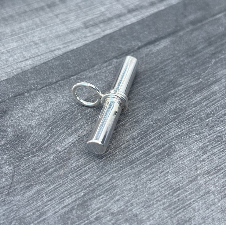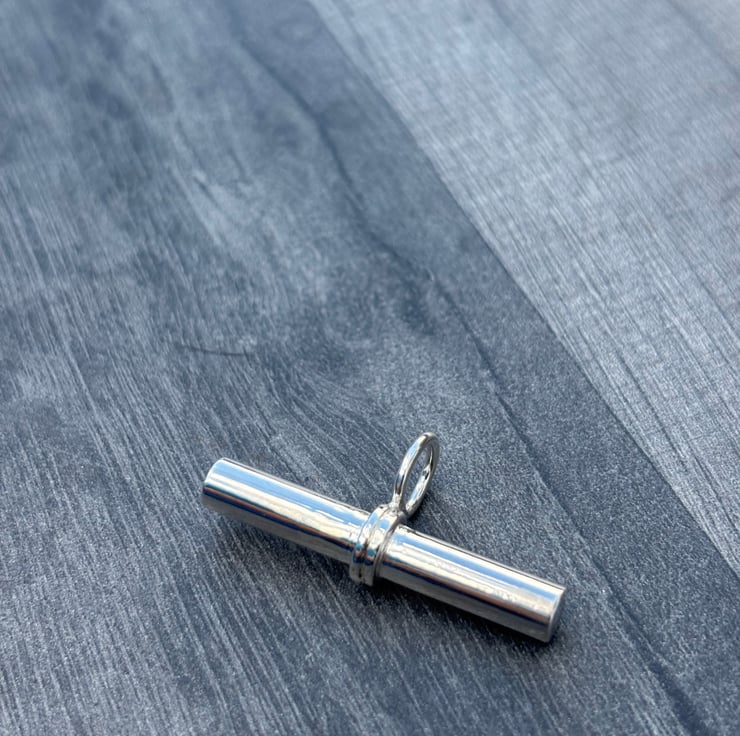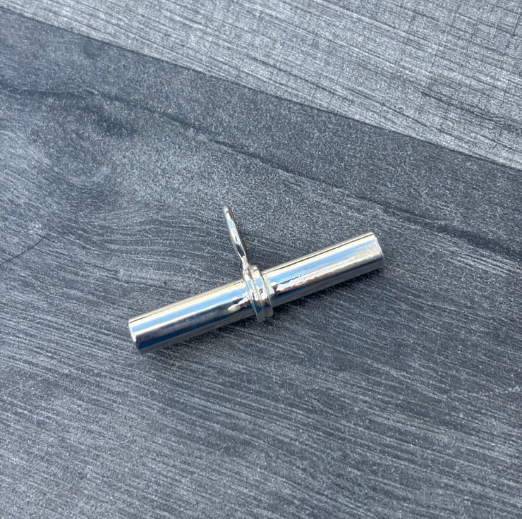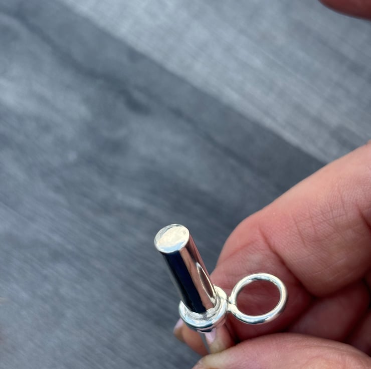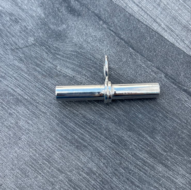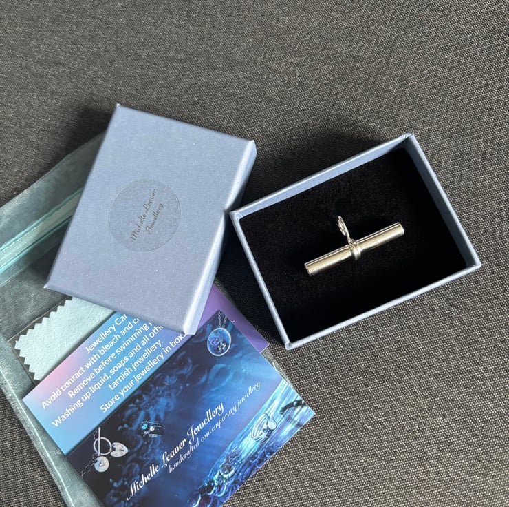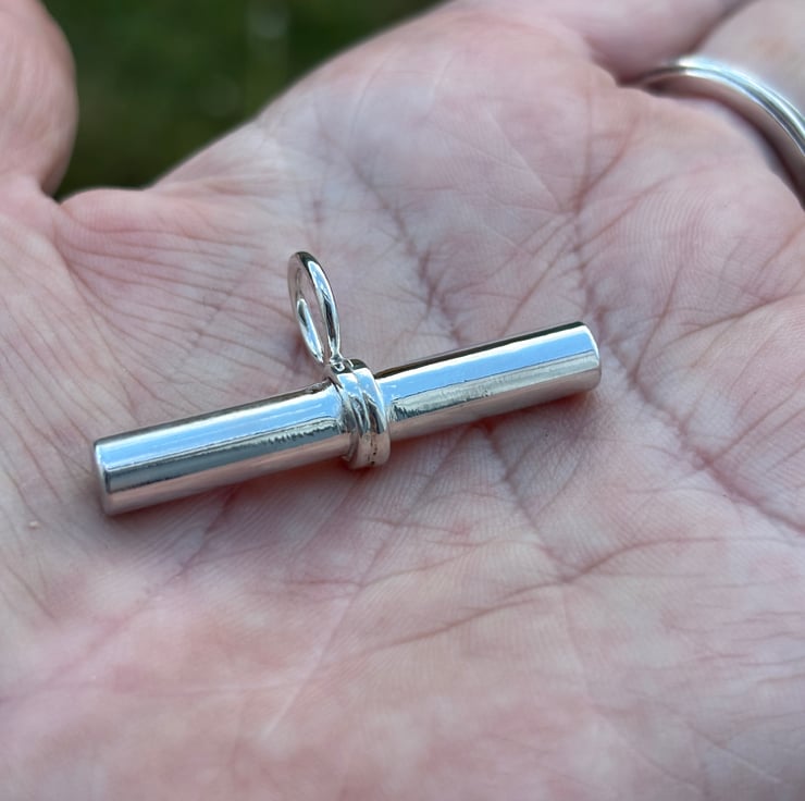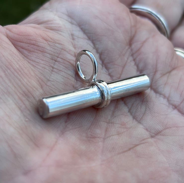 This Sterling Silver T Bar has been handcrafted from solid Sterling Silver. It has a chunky thickness of 6mm and has a length of approximately: 40mm but if you want a slightly different size please contact Michelle. There is a two ring central decorative detail and an attached ring to thread a chain or cord through. Please note this T bar does not include a chain so please let me know the accurate diameter of the size ring on the T bar you require in order to clear the clasp and ring on your chain or cord.