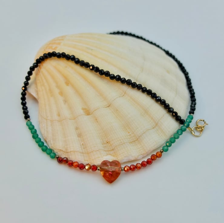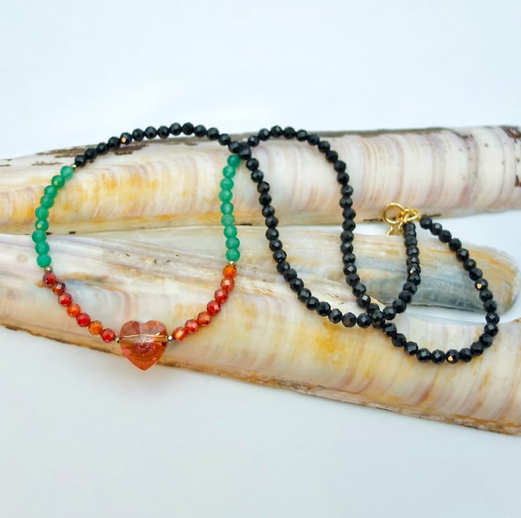 This glittering necklace features a 10mm top quality Austrian crystal heart in the colour 'crystal copper', set between 3mm 'burnt orange' Zircon, Green Onyx and Black Spinel AAA grade micro-faceted gemstone beads.