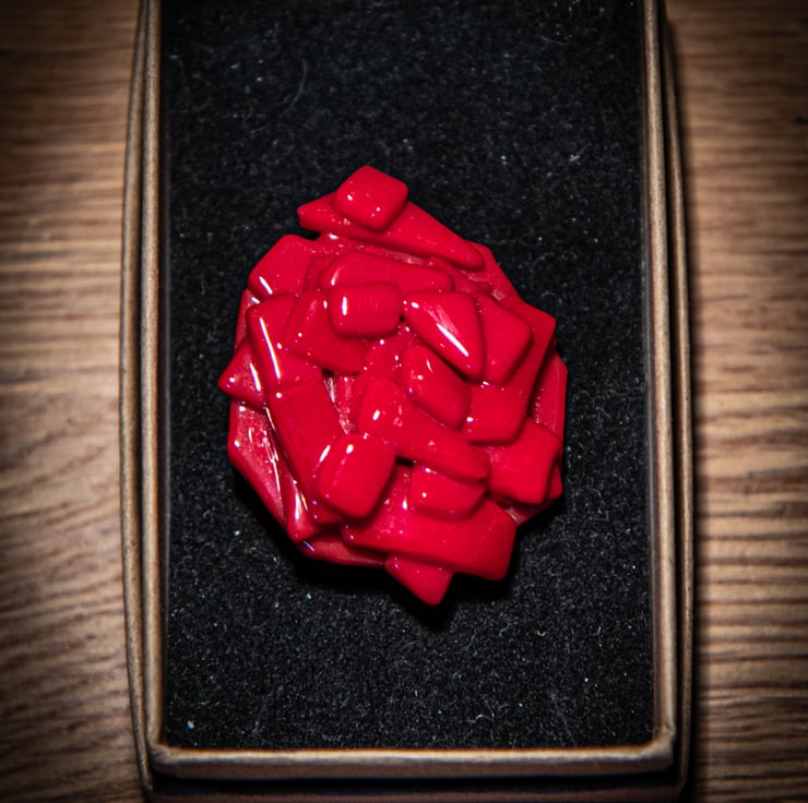 Made from irregular shaped glass pieces fused together in my kiln and fitted with a brooch back. Size approx 3.5 cm diameter