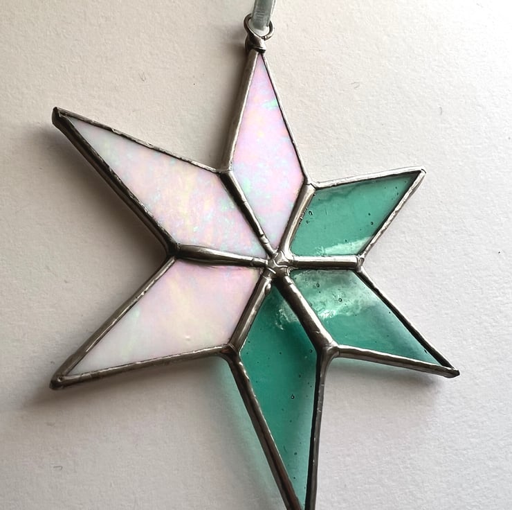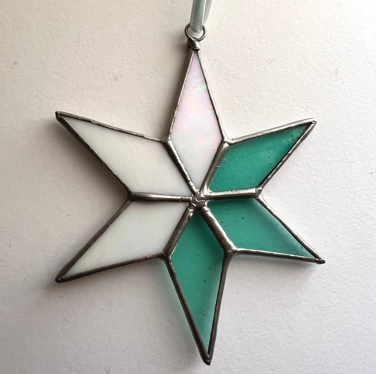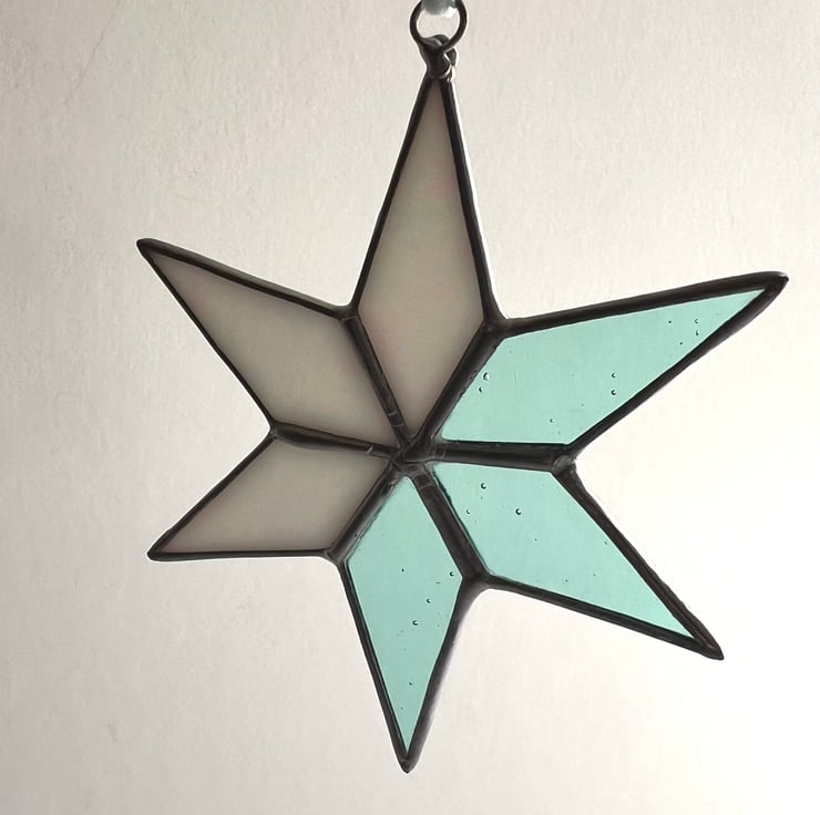 A pretty stained glass star decoration half in a pale blue-green and half in a wispy white glass.