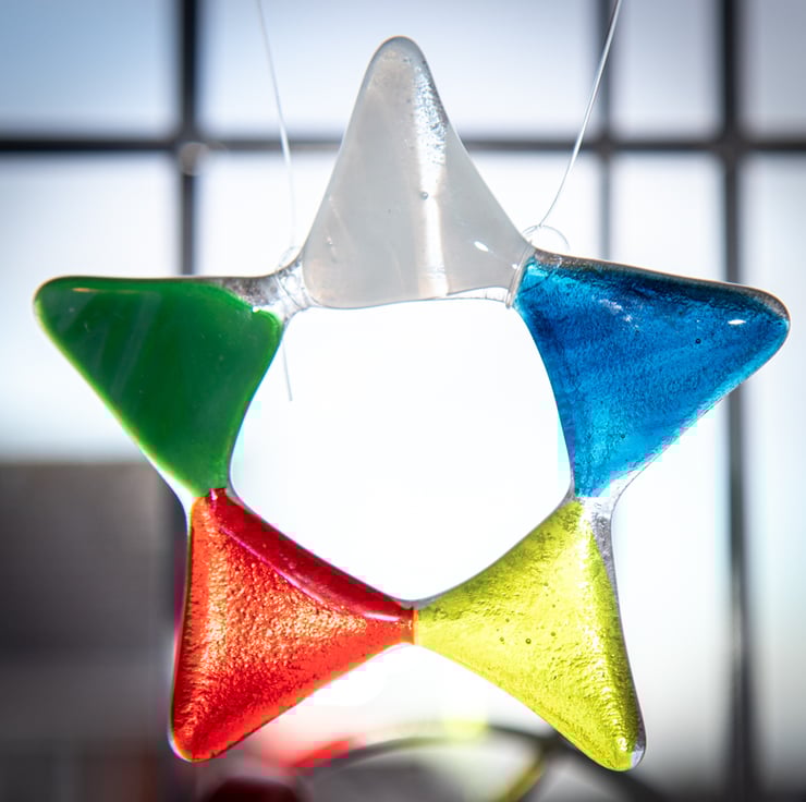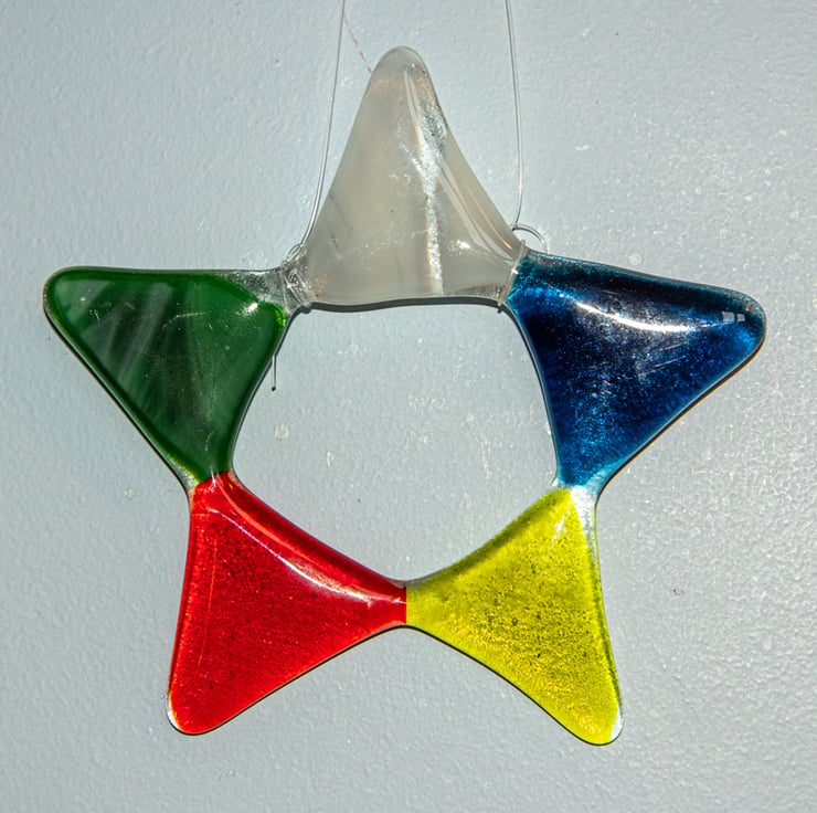 Star shaped light catcher in white, blue, yellow ,red & green fused glass. Has an open centre with hanging thread. Approx 12 X 12 cm.