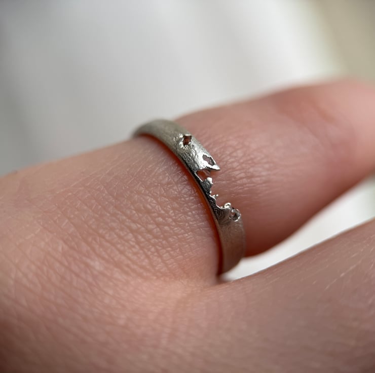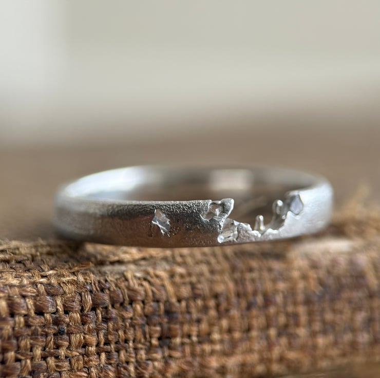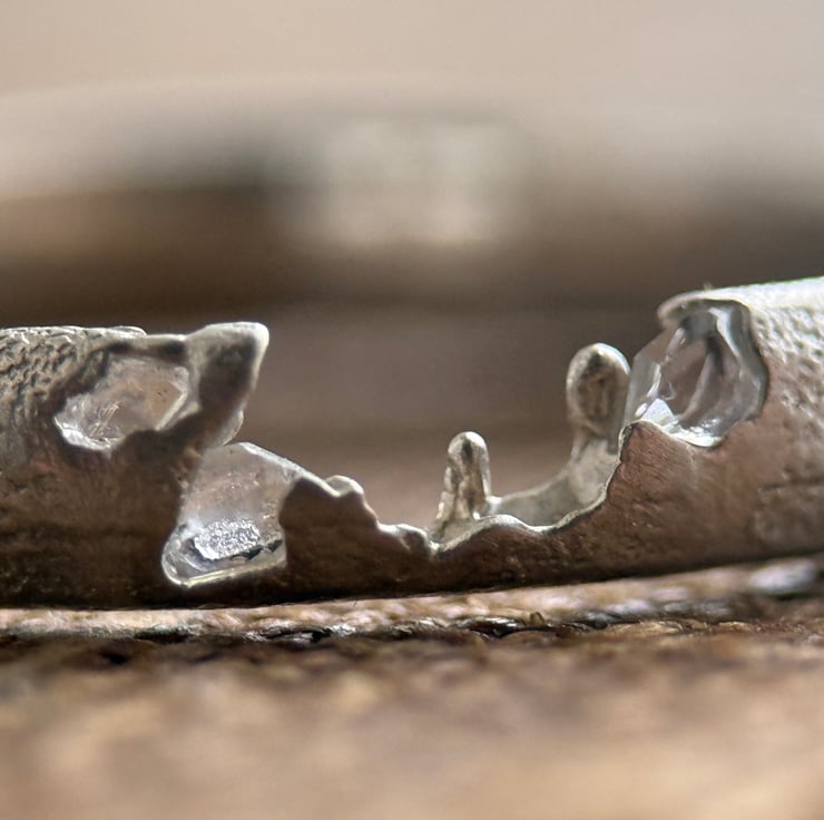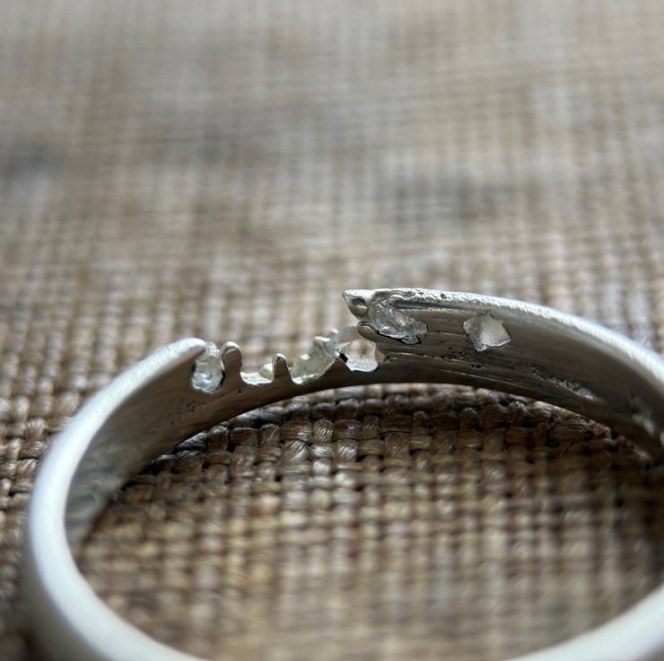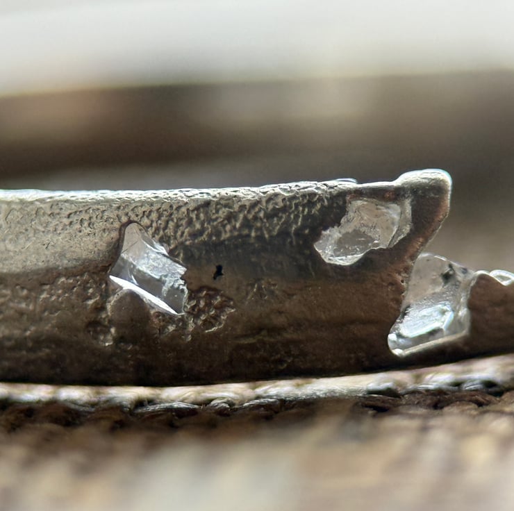 A one of a kind recycled Sterling silver Herkimer Diamond crystal ring, sand cast with natural rough Herkimer Diamonds (a type of quartz) cast directly into the organic, D shaped silver band.