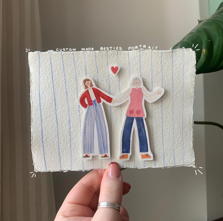 The portrait will be custom made to specifically look like you and your bestie in a specific outfit for a more personal touch