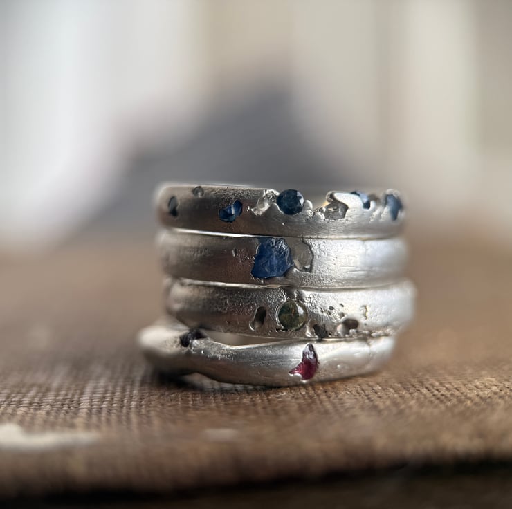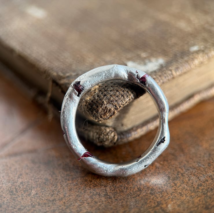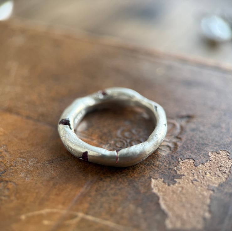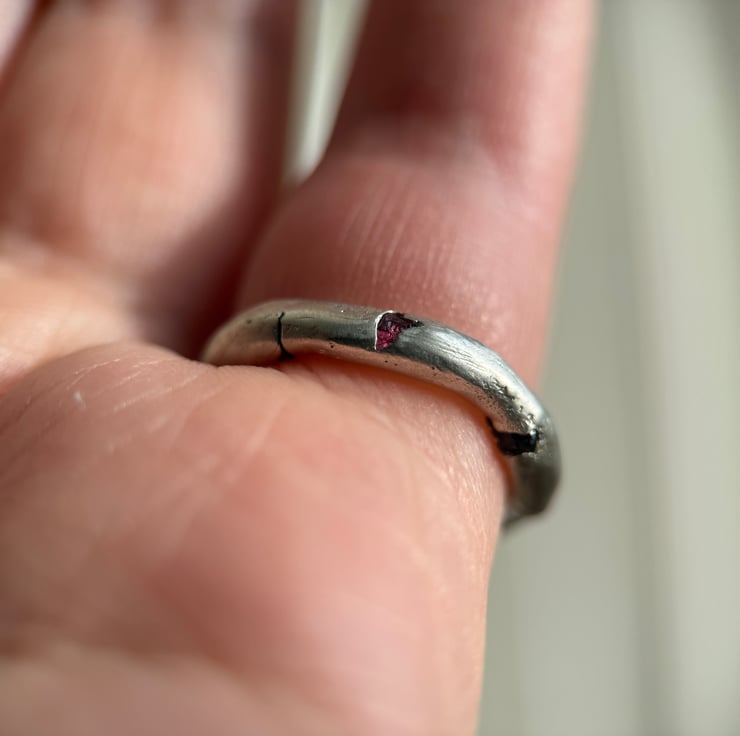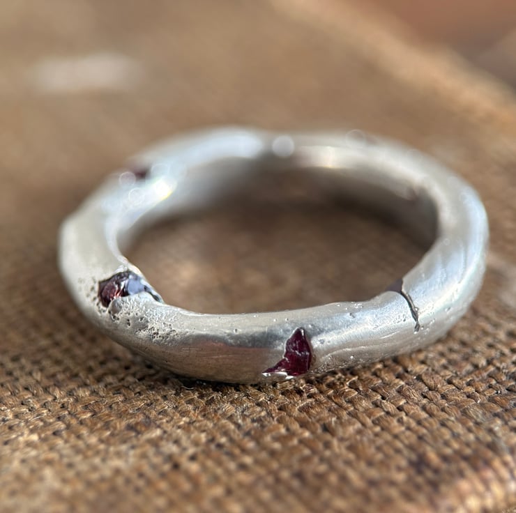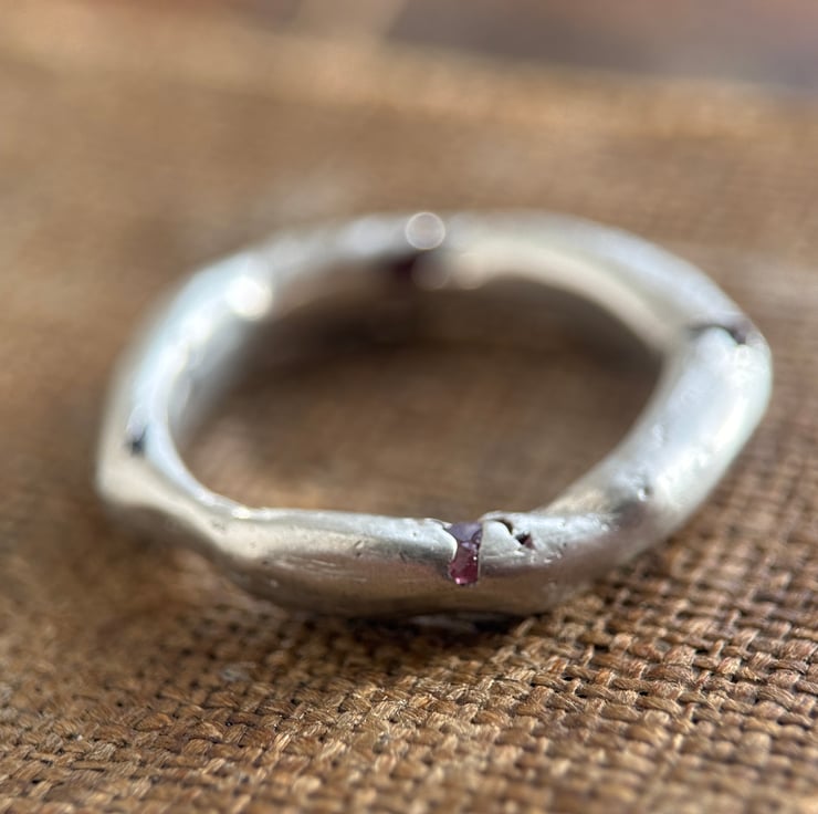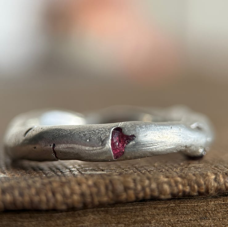 A one of a kind recycled 800 European silver spinel ring, sand cast with a natural rough red spinel crystal cast directly into the freeform silver band.