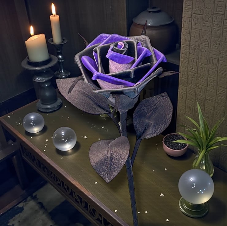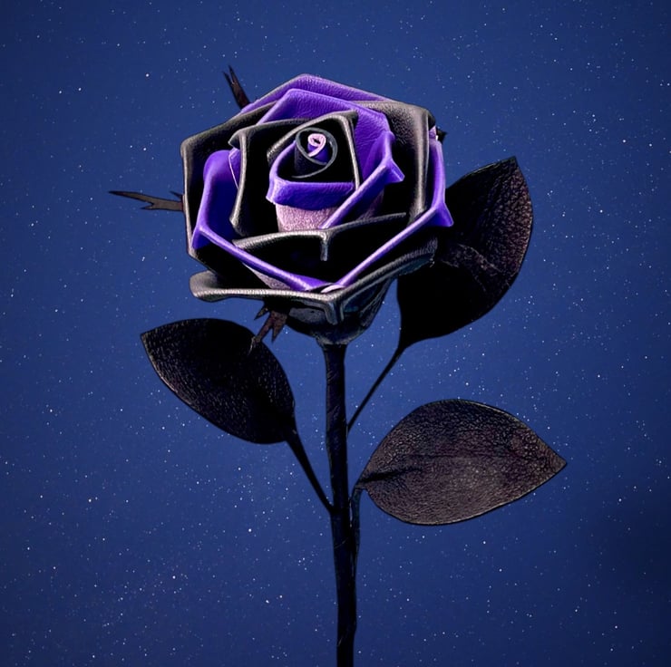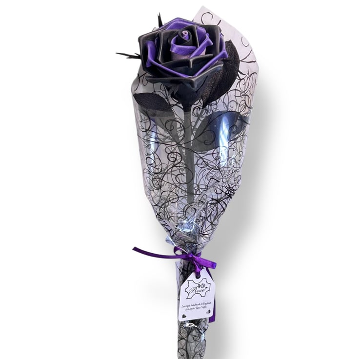 Handcrafted 'Shadowspell' black and purple long stem leather rose. Each petal is hand-cut from premium soft leather and individually shaped, then assembled to create a striking rose that will never wilt, fade, or die.