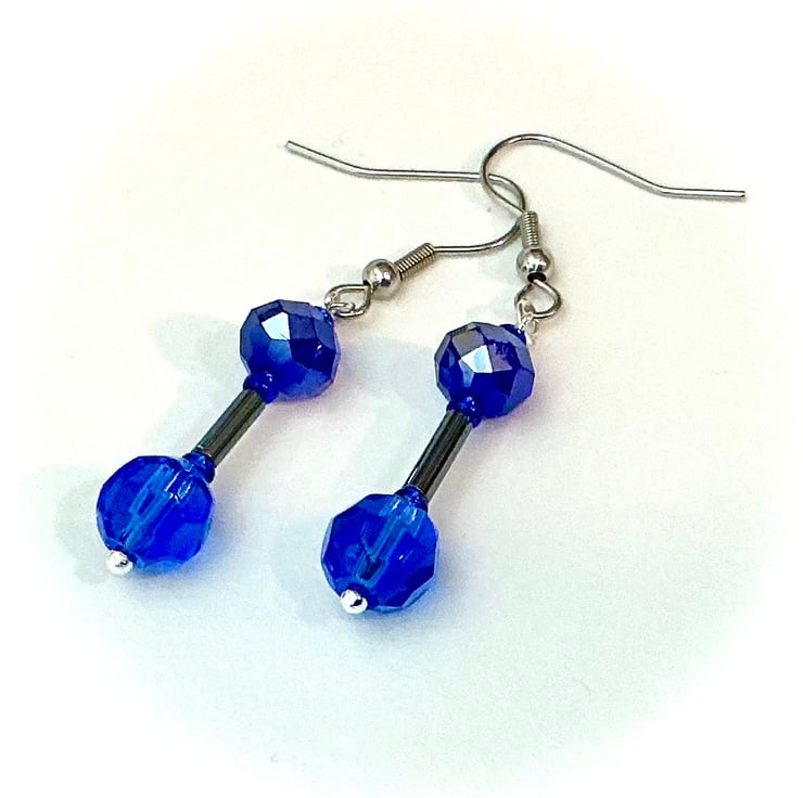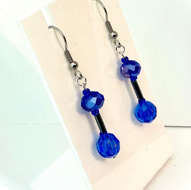 A pair of beaded earrings made using royal blue coloured faceted glass beads.