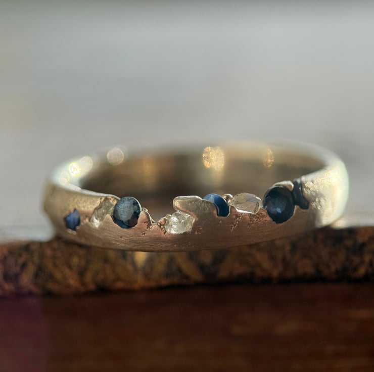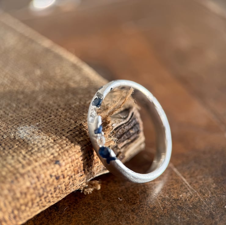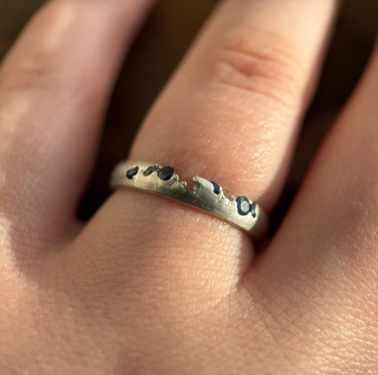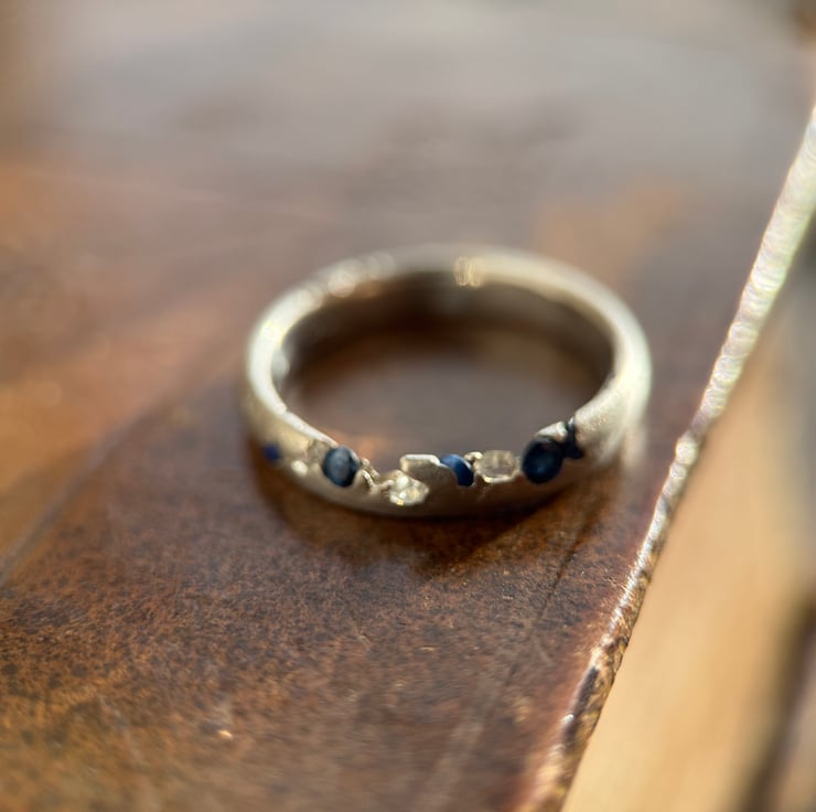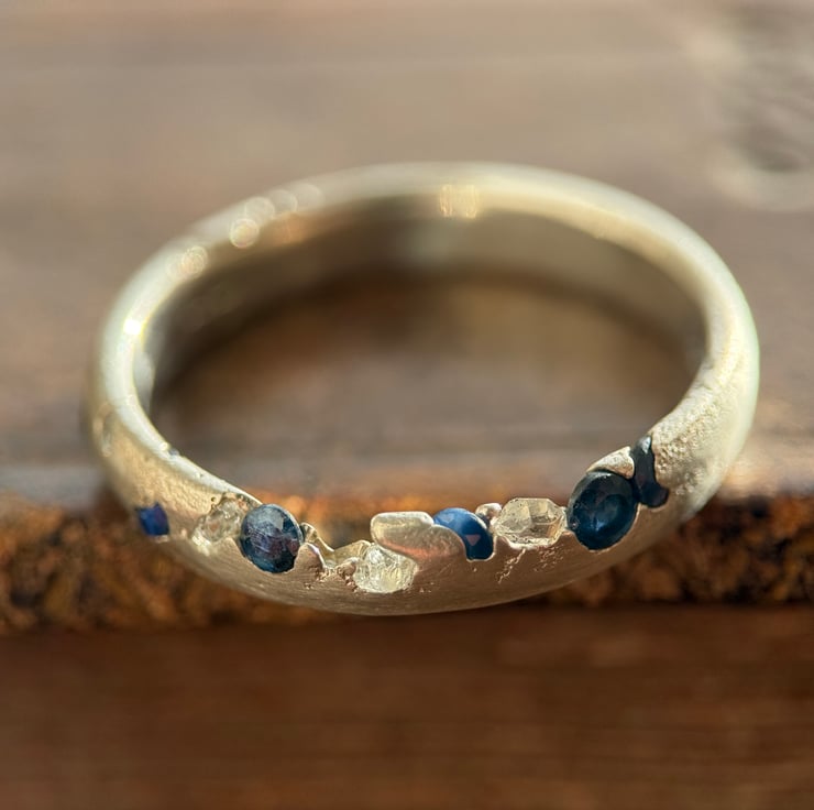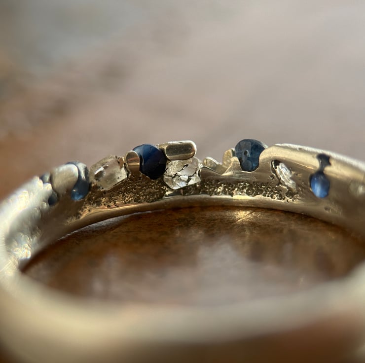 A one of a kind recycled 800 European silver sapphire and herkimer diamond ring, sand cast with a natural Herkimer diamond quartz crystal and round cut sapphires cast directly into the organic oval shaped silver band.