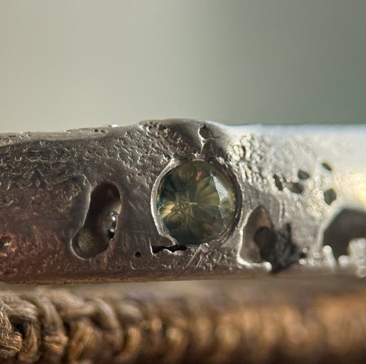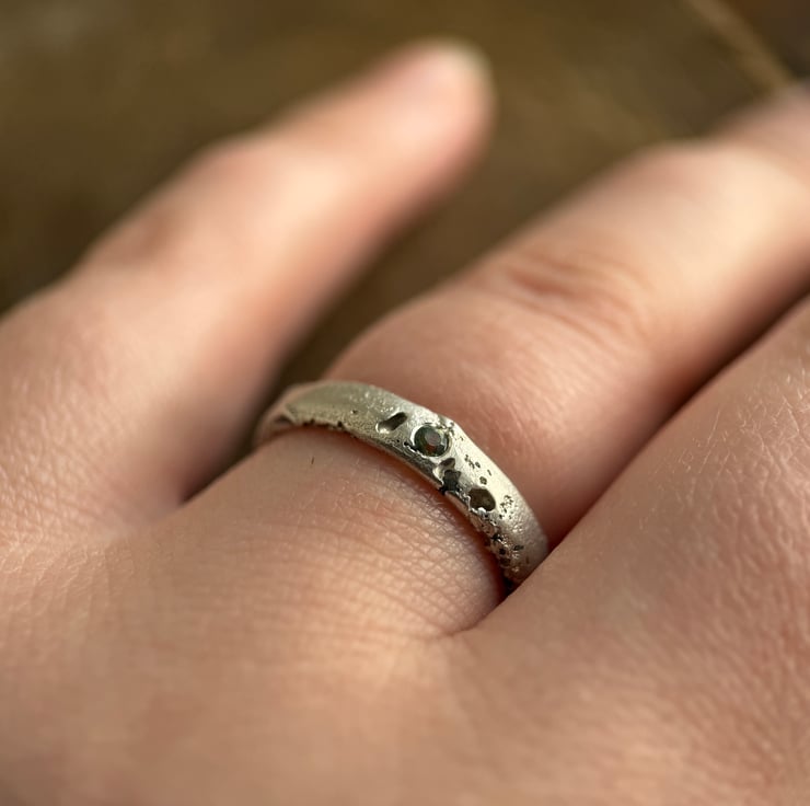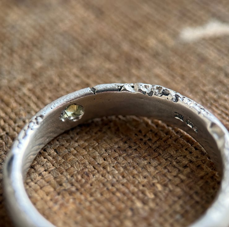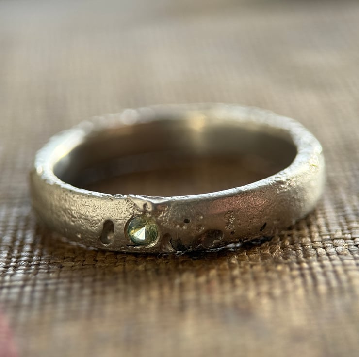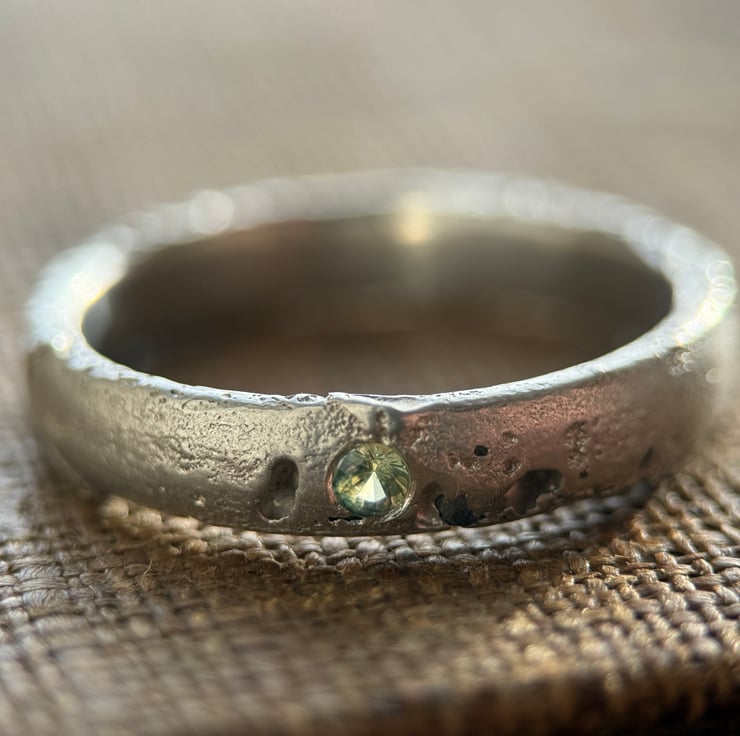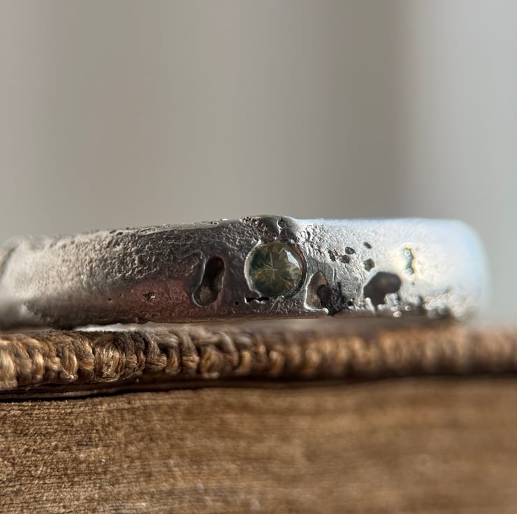 A one of a kind recycled 800 European silver green sapphire ring, sand cast with a natural round cut sapphire set into the organic oval shaped silver band.