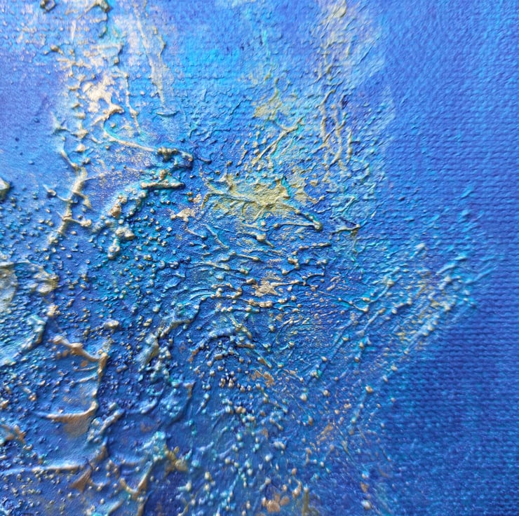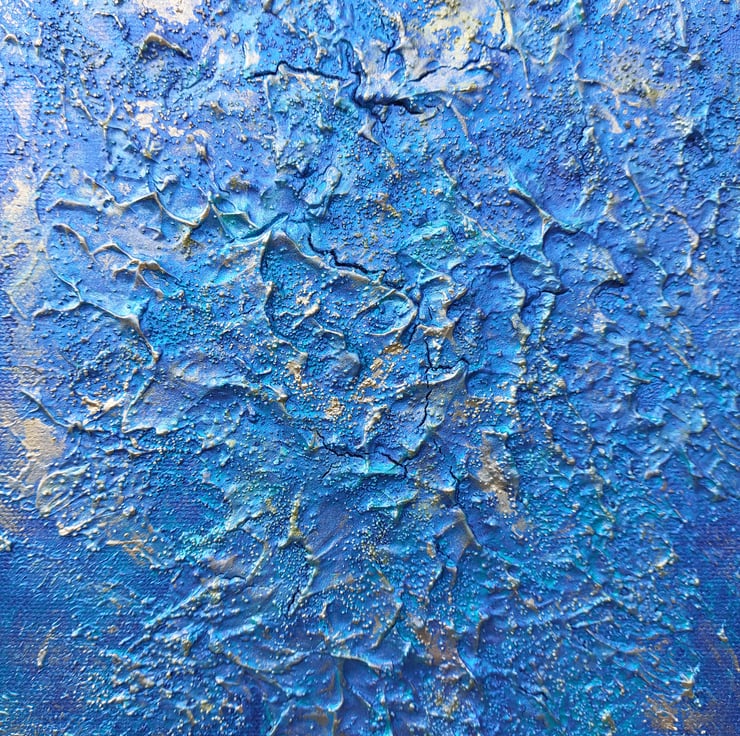 I went with the flow with this canvas adding texture and crackle paste. I felt like it was like a sand bank on a bright day, so I painted it with a variety of blue and turquoise tones with gold accents. Due to the iridescent nature of the paints it will change with different lights