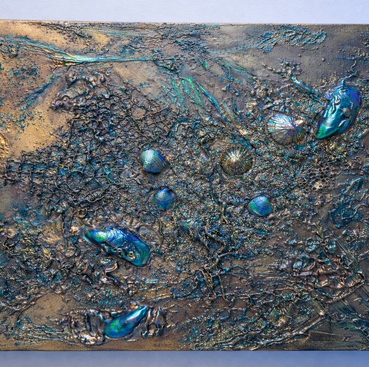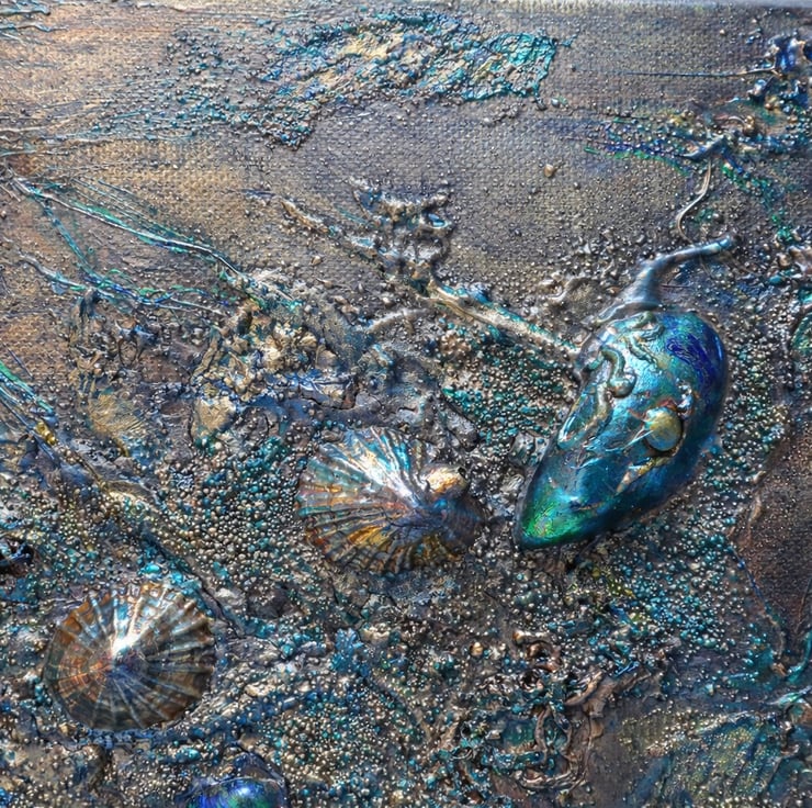 Gold and green metallic paints feature on this highly textured mixed media canvas. Incorporates seashells collected from Cornish beaches, net, rustic threads and various texture pastes. Inspired by my love of beachcombing.