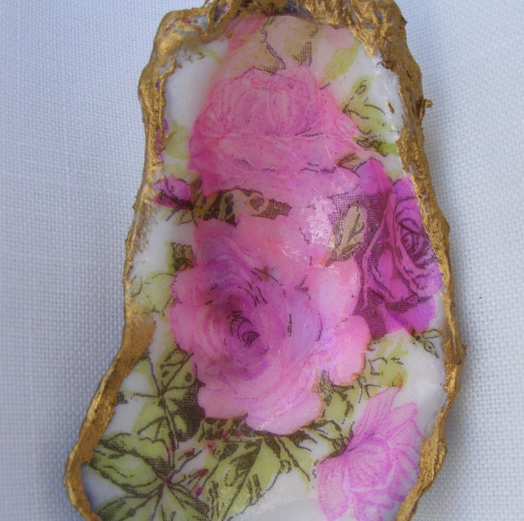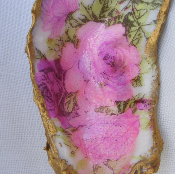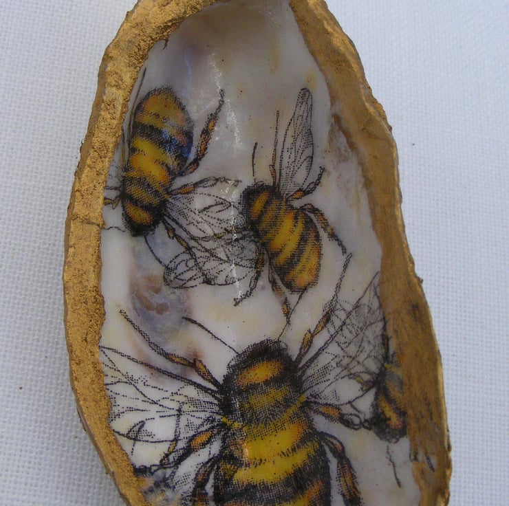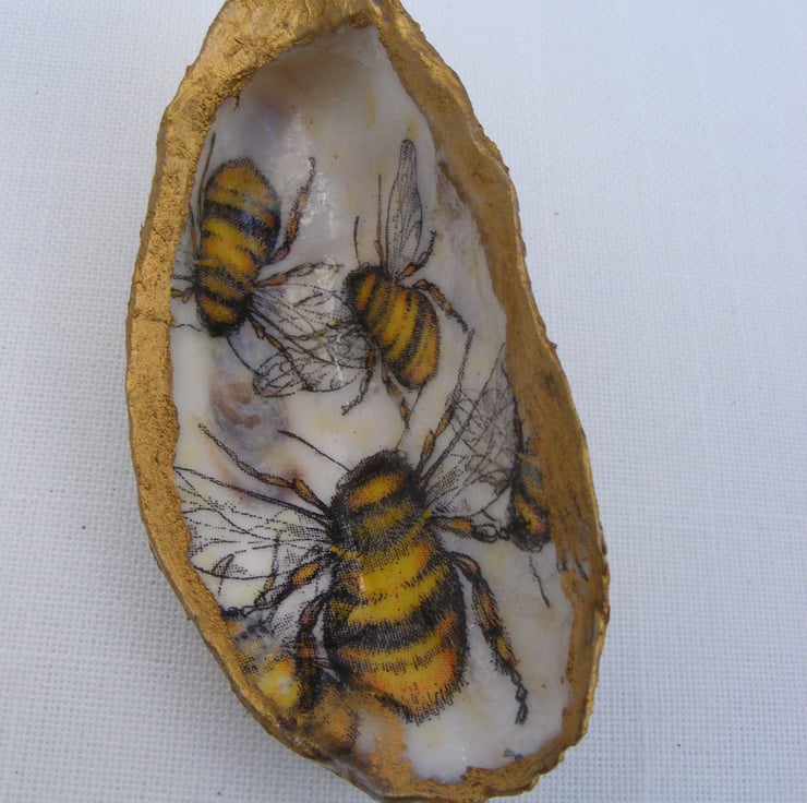 These 4 pretty trinket dishes have been decoupaged with floral and bee napkins. All 4 have been glazed. Gold leaf has been applied to the edges of the shells.