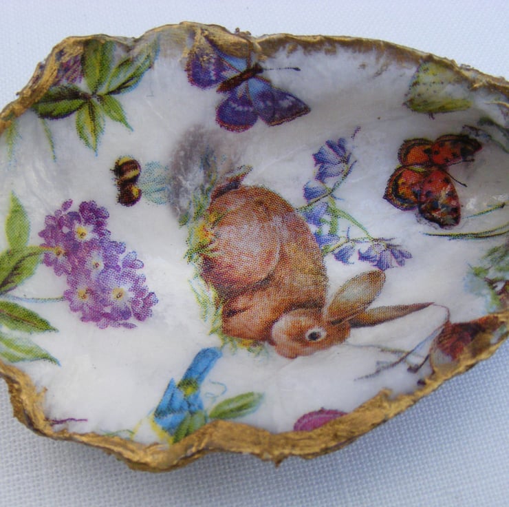 Set of 3 rabbit, lily and poppy oyster shell trinket dishes