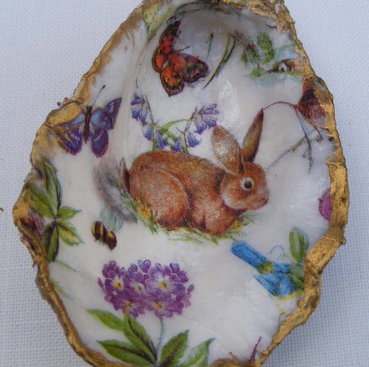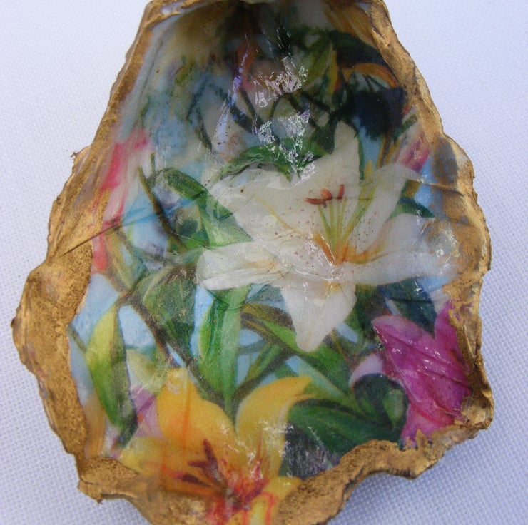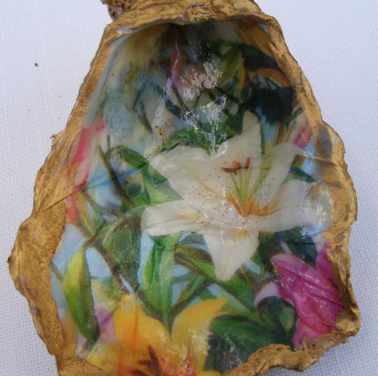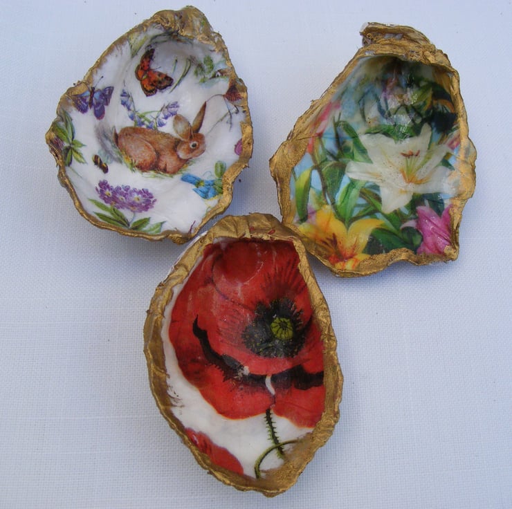 These 3 lovely oyster shells have been decoupaged with floral napkins. All 3 have been glazed. Gold leaf has been applied to the edges of the shells.