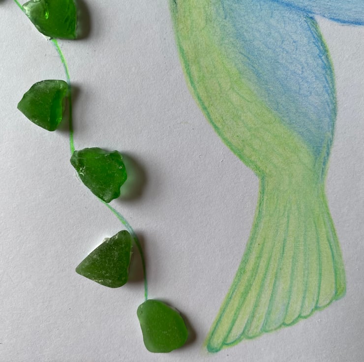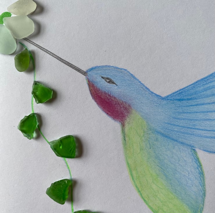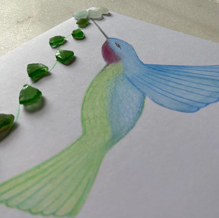 A pretty hummingbird design with white and green sea glass from the beaches of Cornwall.
