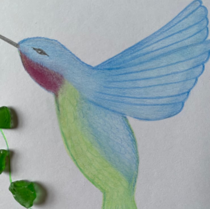 The hummingbird has been drawn with oil based pencils.