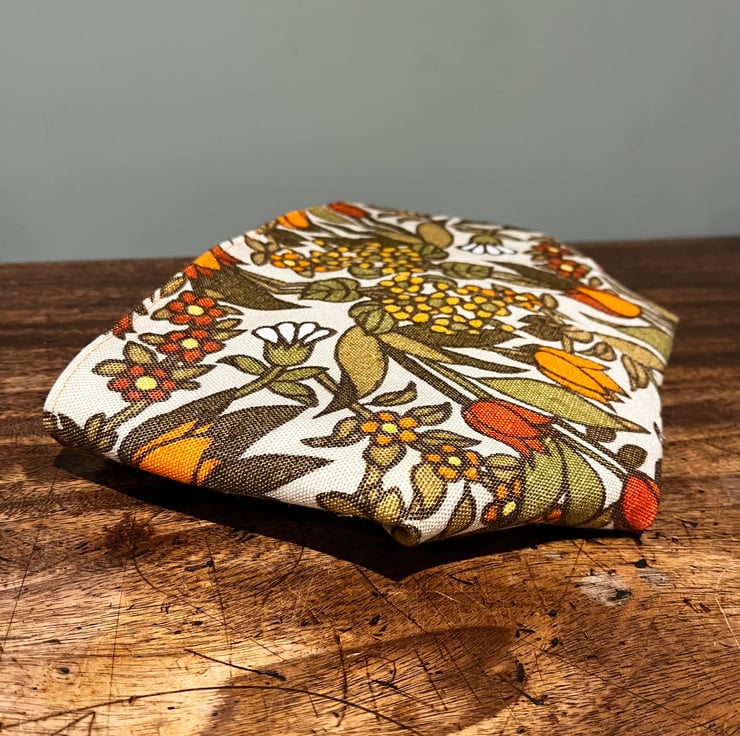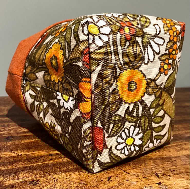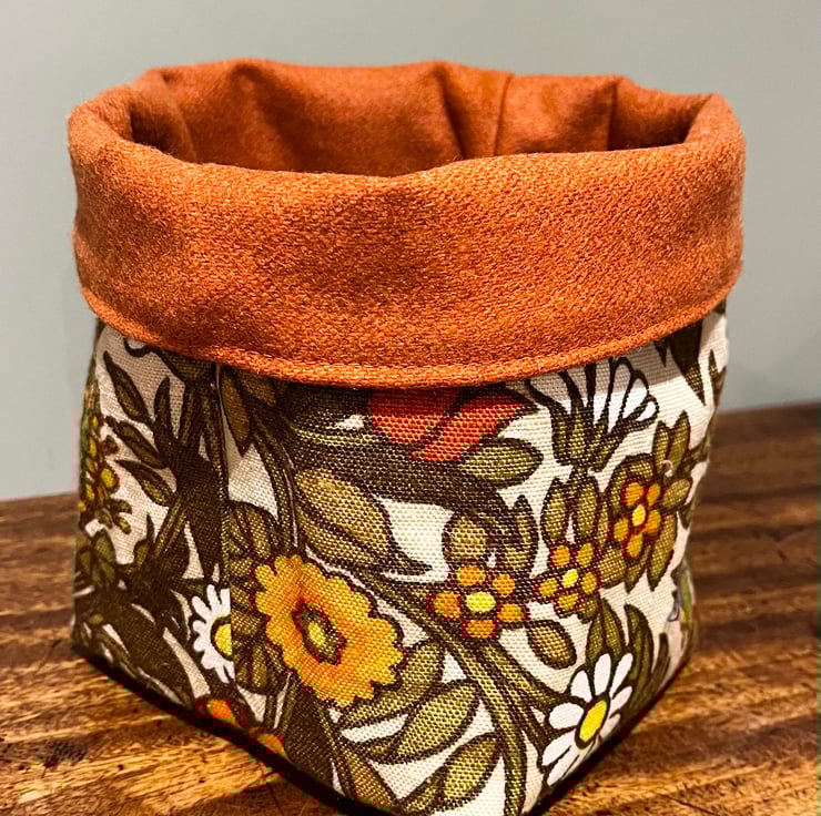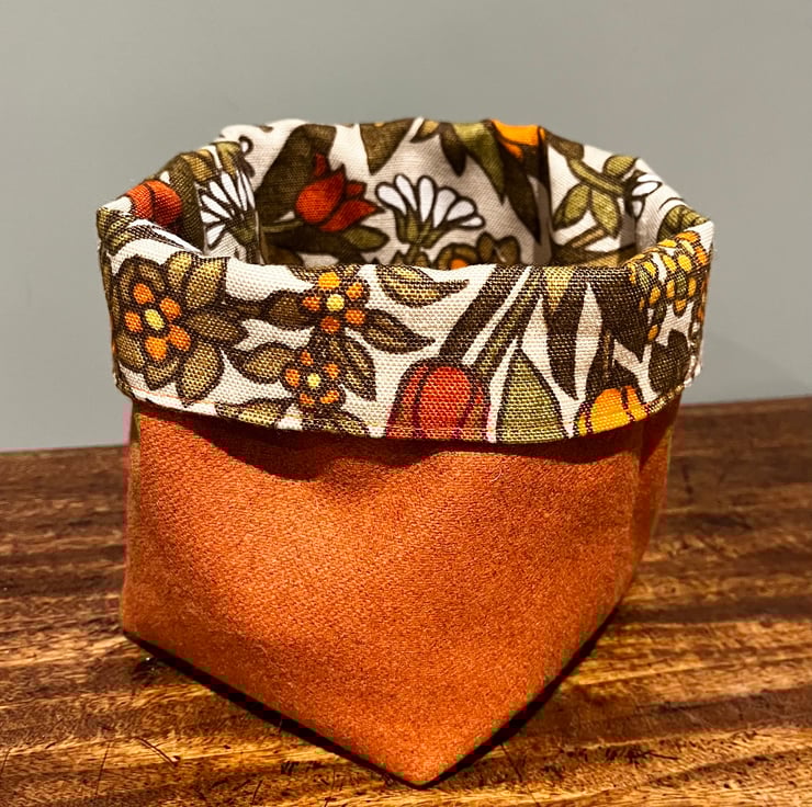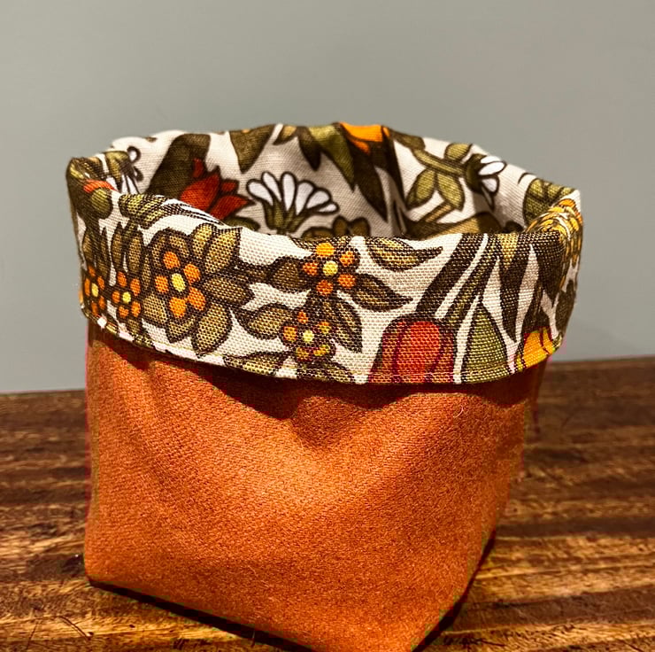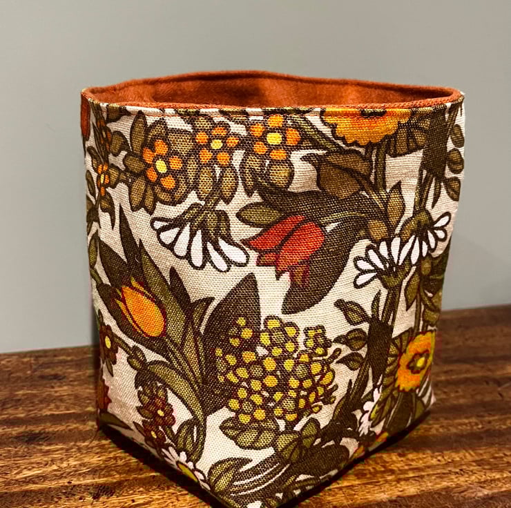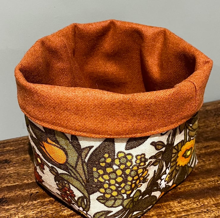 Reversible fabric storage basket made from pretty vintage Flower Waltz linen blend in yellow and orange shades and orange wool rich upholstery fabric . A layer of interfacing between the layers makes it sturdy. Can be used with a turn-down to make the most of the contrasting fabrics.