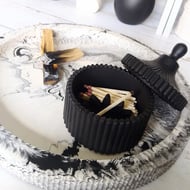 It comes with a patch of striker paper on the back, one spare, 23 long matches and one refill. The inside is painted with heat-resistant black, so once you strike your match, you can drop it back in — headfirst, safely — without hunting for a bin or leaving a trail of ash across your shelf. Because even your spent sparks deserve somewhere clever to land.