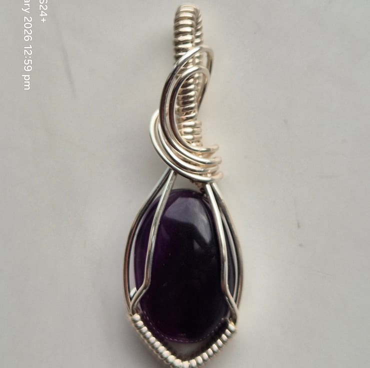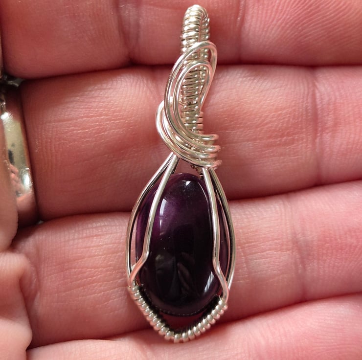 Beautiful hand crafted Amethyst pendant, wrapped in silver plated wire. This piece features a smooth, polished deep purple amethyst cabochon, secured in an elegant wire wrapped setting with decorative bail.