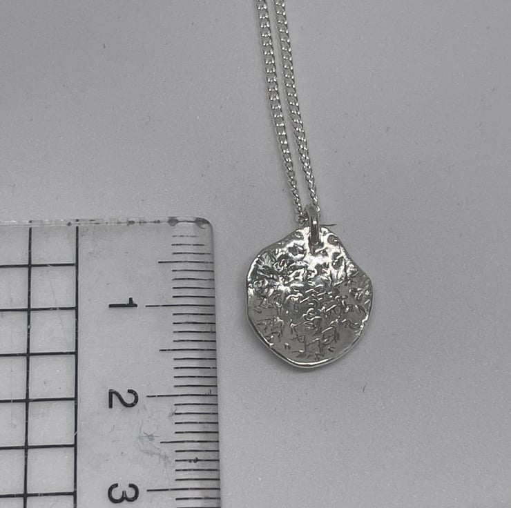 This is made from precious metal clay, when it is in the clay form I take a poppy seed head and press the top repeatedly into the silver clay. Each time I do this the texture will be different and as these are irregular in shape each necklace is unique (I never try to repeat the shapes).