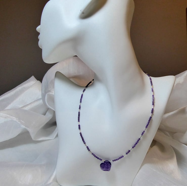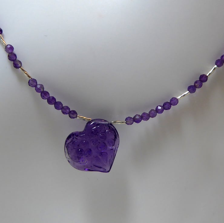 The carved AA plus quality amethyst heart (approx.15mm x 16mm) is accented with tiny, textured, fine silver tube beads and AAA quality micro-faceted 2.25mm amethyst beads.