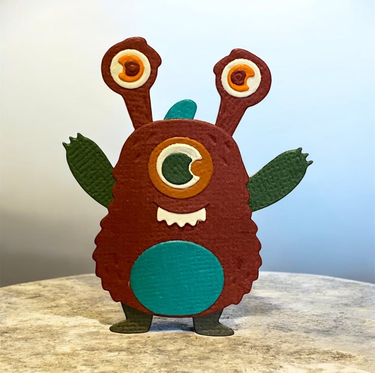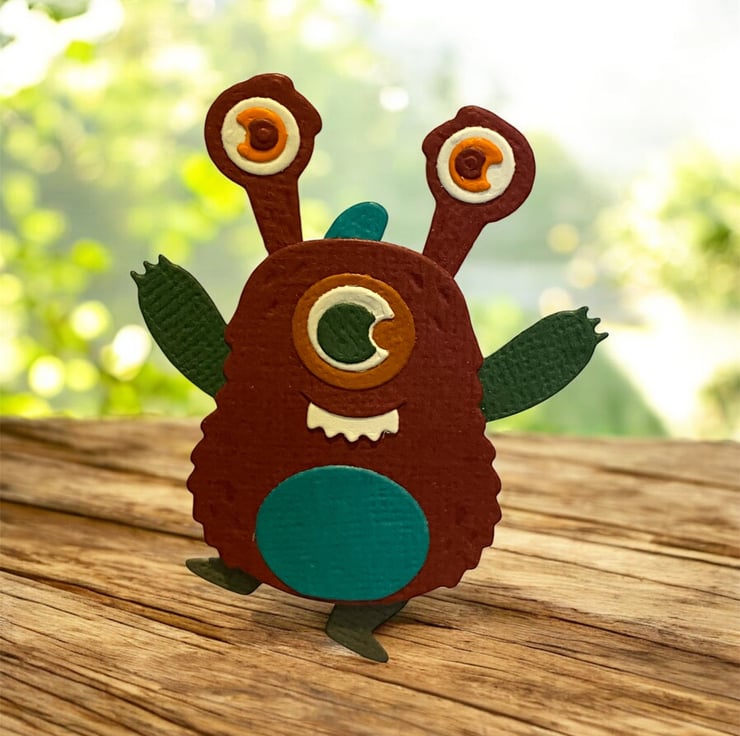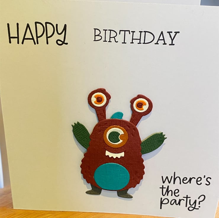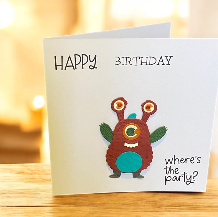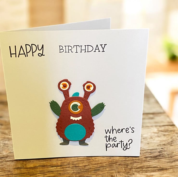 Celebrate a birthday with a burst of colour and character! This handmade card features a delightfully quirky monster with eye stalks, a teal belly, and cheerful green arms – all brought to life with moveable legs that wiggle and dance with joy. Perfect for kids, teens, or anyone who loves a bit of birthday silliness.