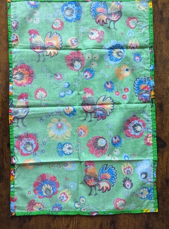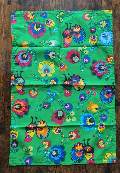 Brighten your home with this vibrant Folk Art Tea Towel. Featuring a bold green backdrop and traditional motifs, it’s a perfect blend of heritage style and kitchen practicality.