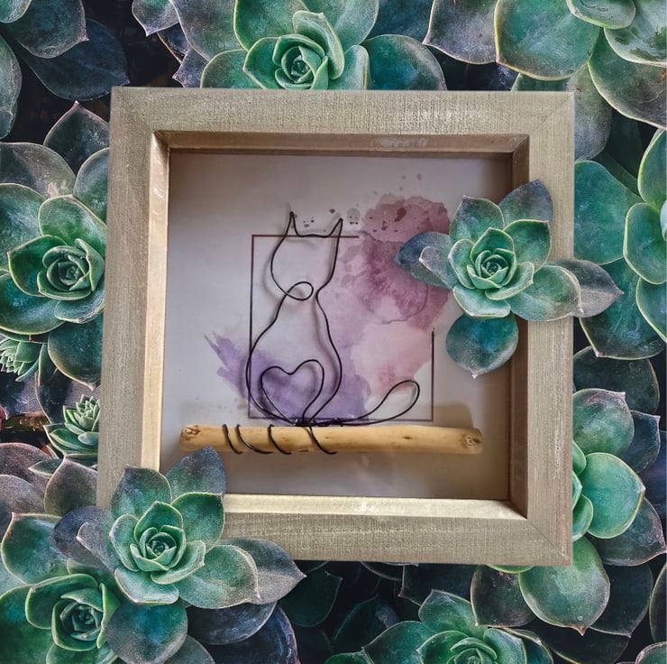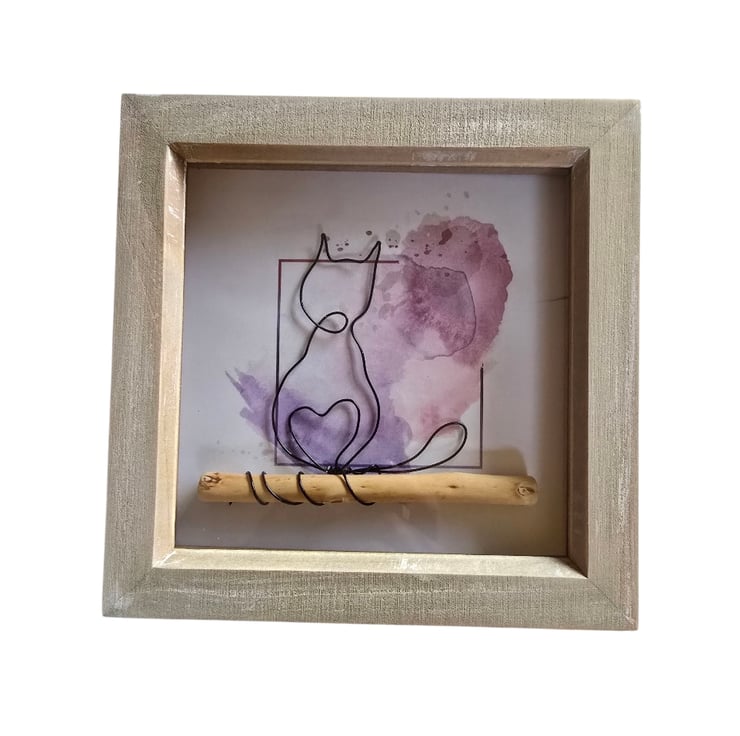 This one-of-a-kind framed artwork is lovingly handmade using simple, natural materials and a playful, organic approach. A free-form wire cat sitting on a smooth piece of wood, carefully shaped by hand so no two designs are ever the same. Set against a soft watercolour wash, the wire lines create gentle movement and a sense of calm, while the rustic wooden frame adds a cosy, folksy charm.