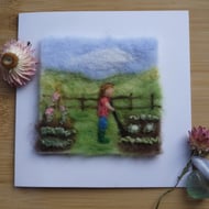 Handmade needle felted 6 inch greetings card featuring an image of a woman walking her dog in a country landscape. Each of our cards is a unique handmade design and comes with a white envelope and cellophane bag.