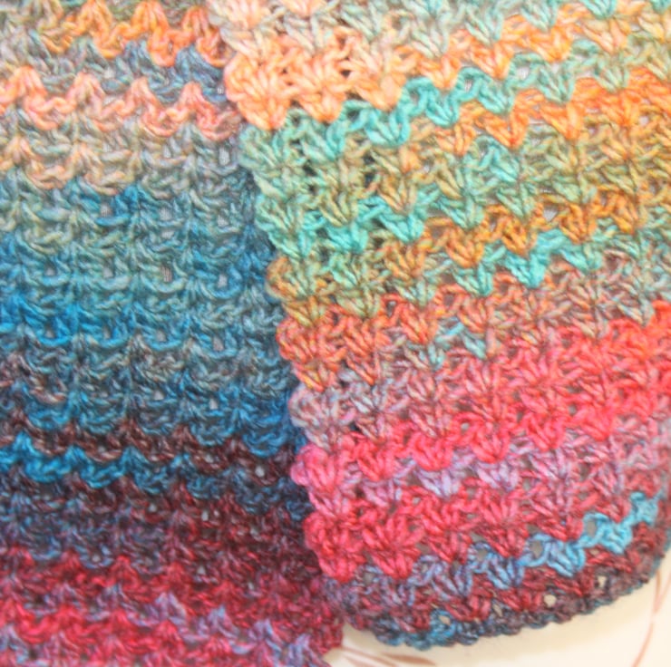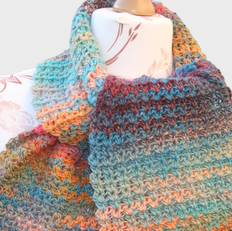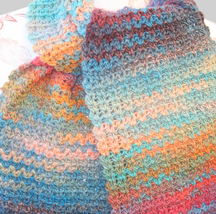 A good quality, soft scarf of rainbow colours, ideal for a chilly wintry day. Made with kind permission of the original pattern designer and suitable for all adults. The scarf measures approximately 64 inches (L) by 10 inches (W). It is 100% acrylic.