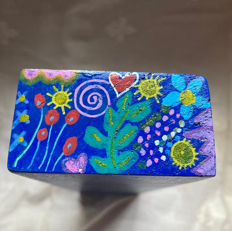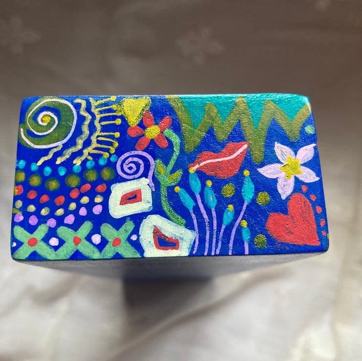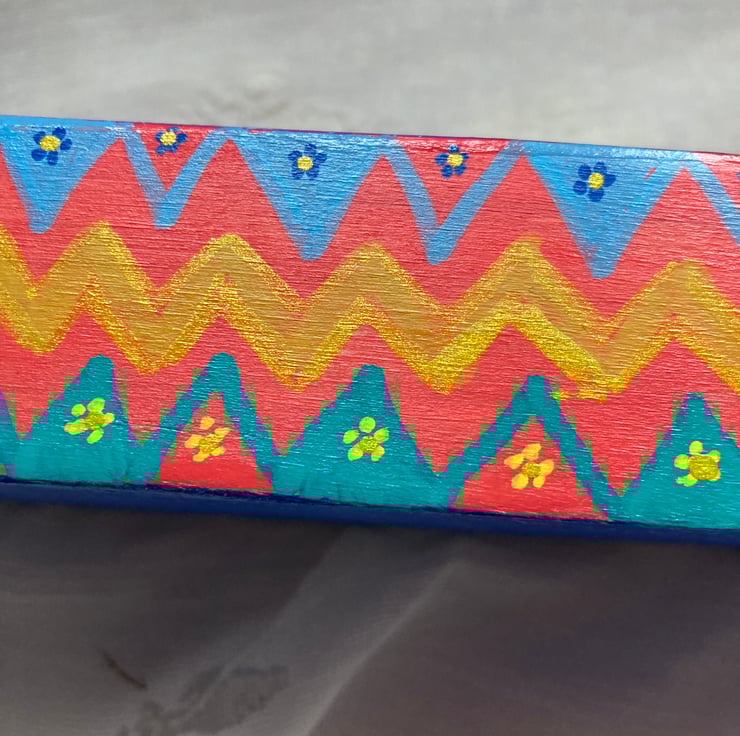 The top and end sides are painted in colourful abstract doodles. The long sides are painted in a zig zag design with small flowers and the base is blue.