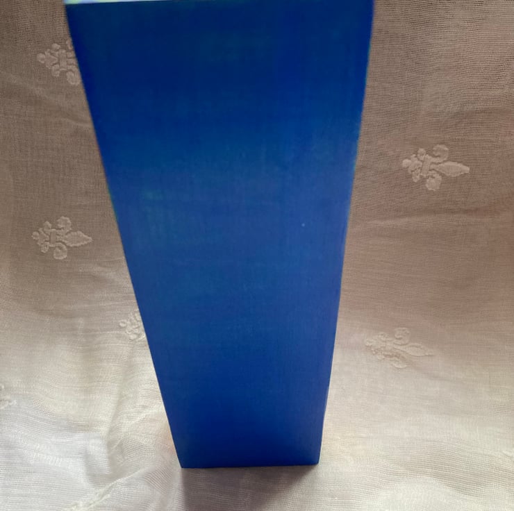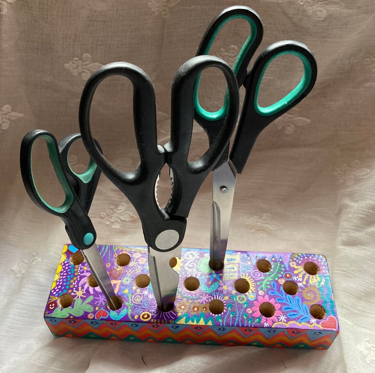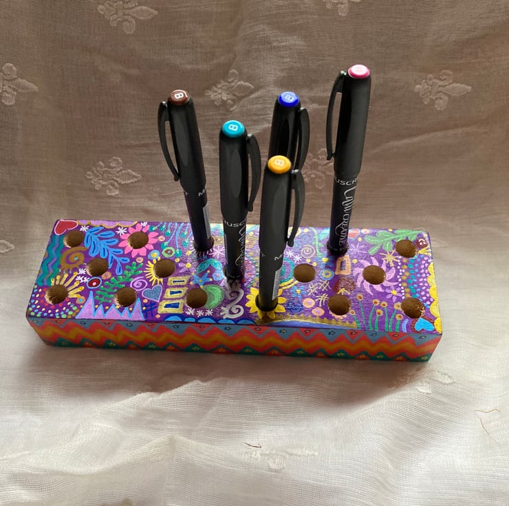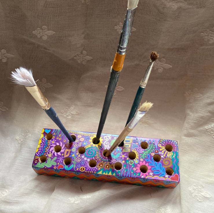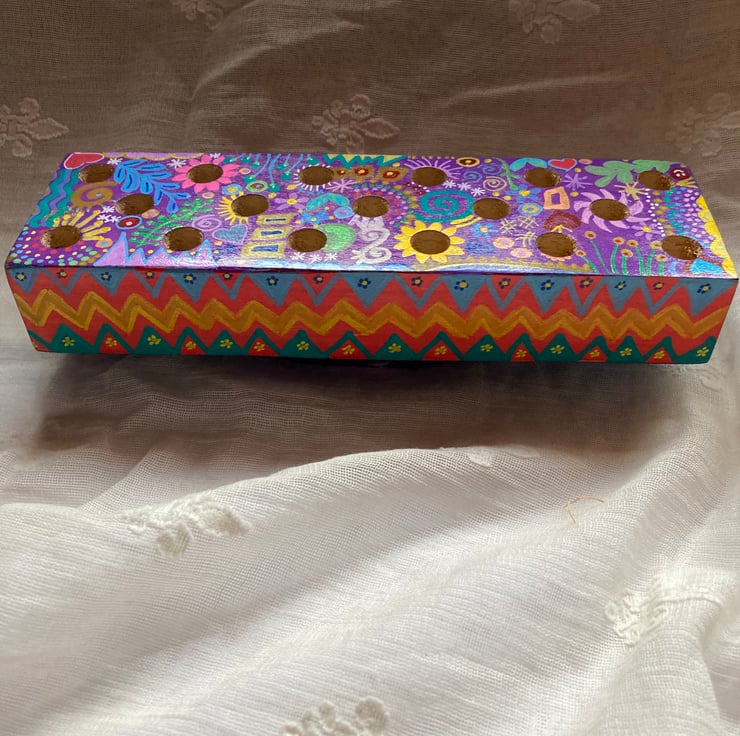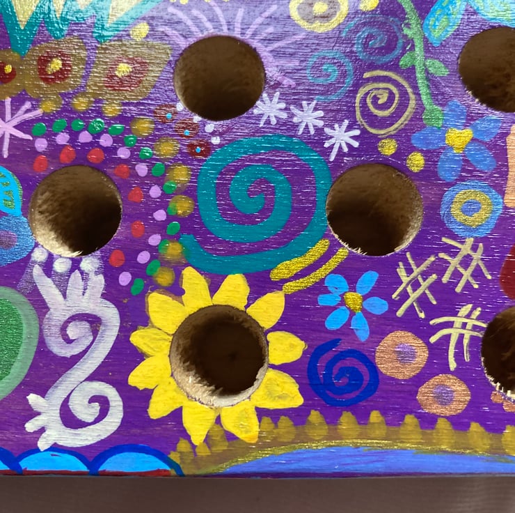 This solid wood block has been brightly painted in abstract doodles and varnished.