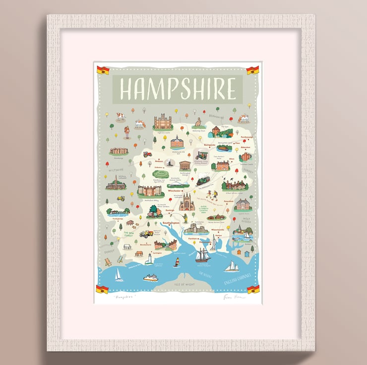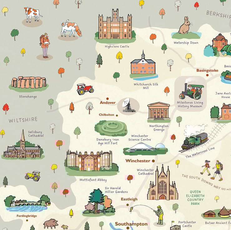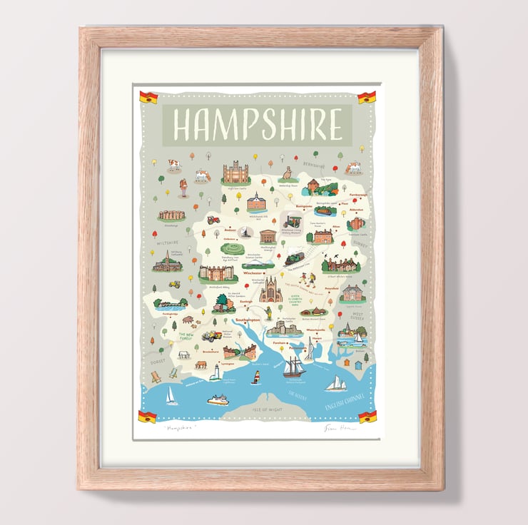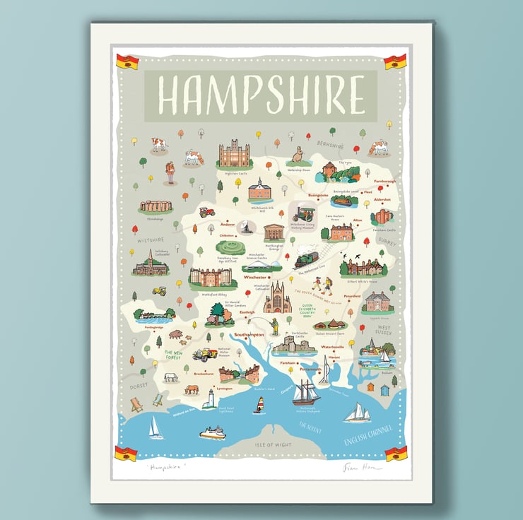 Beautiful map poster of Hampshire in southern England - home to the New Forest, Portsmouth, Southampton and Winchester. Also known for the South Downs Way and as the home county of Jane Austen.