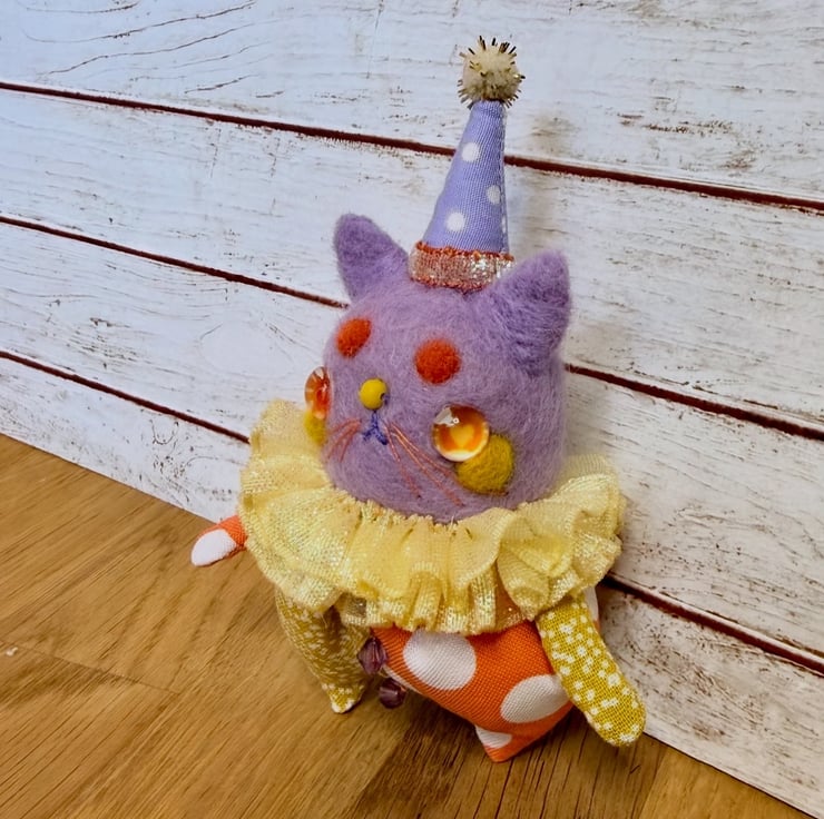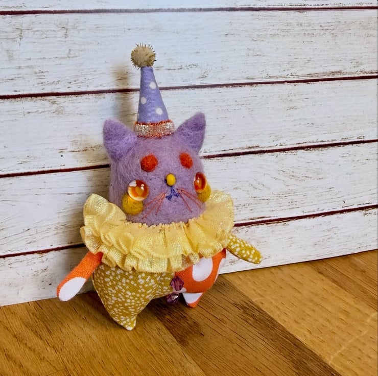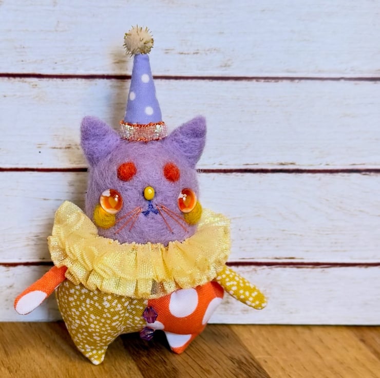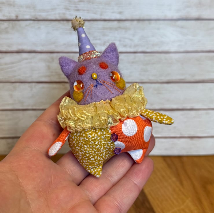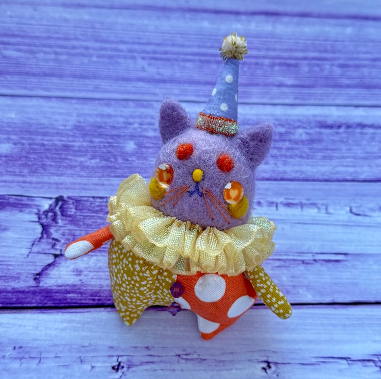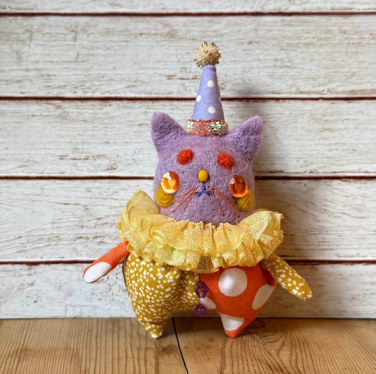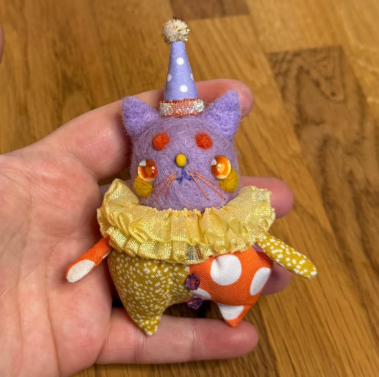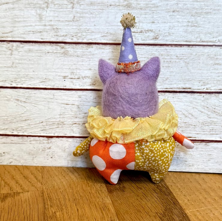 This tiny needle-felted wool doll has glass eyes and wears mismatched polka dot orange and yellow print cotton outfit. Outfit has upcycled bead buttons. Kitty Clown wears sparkly yellow trim neck ruffle hand sewn into place. Kitty has a polka dot pointy hat topped with sparkly Pom Pom and sparkly trim base. This little kitty has needle felted wool face decorations and bead nose. Kitty measures roughly 11.5cm tall and can come with a transparent loop hanger if desired. This is for decorative purposes only and not a toy. Gift wrapped and sent in recycled or recyclable packaging.