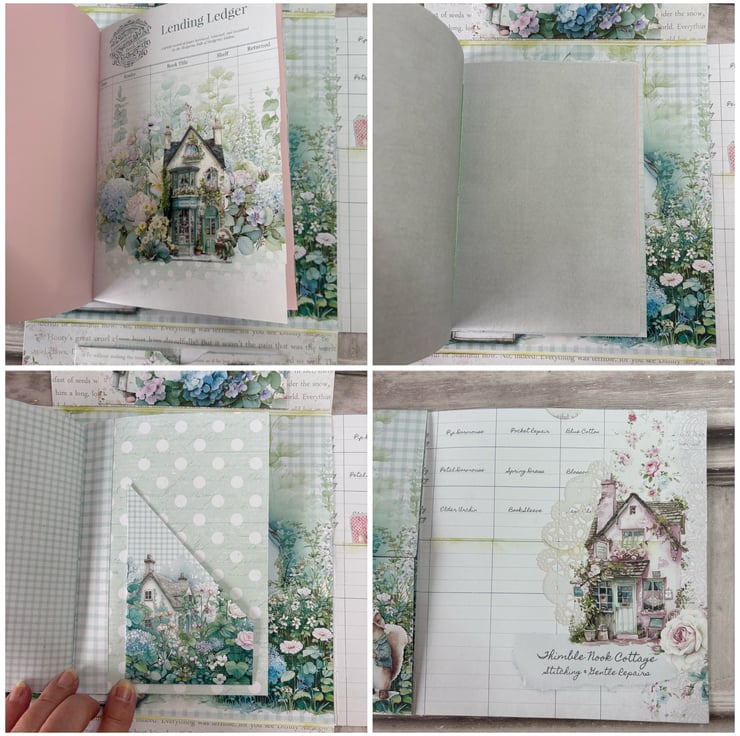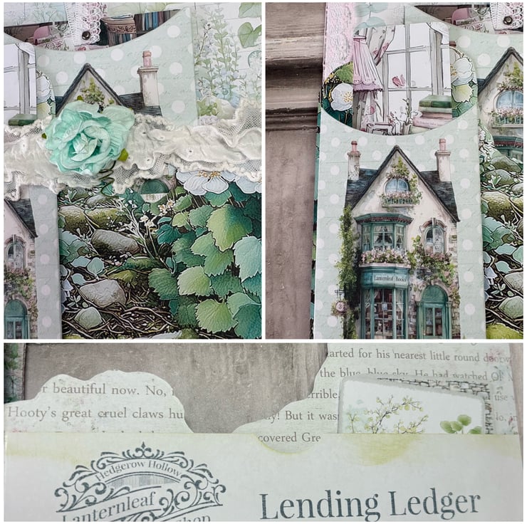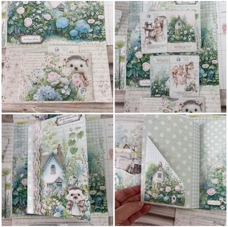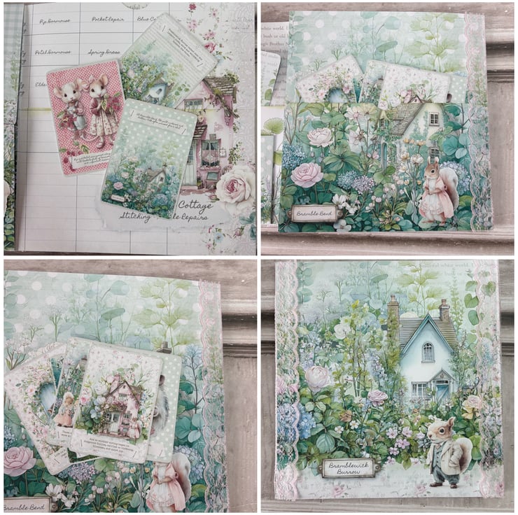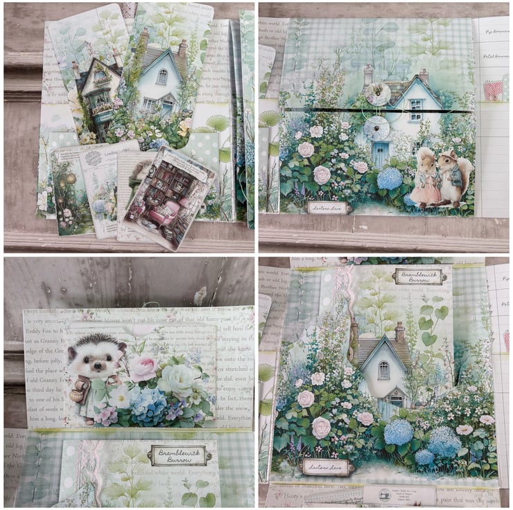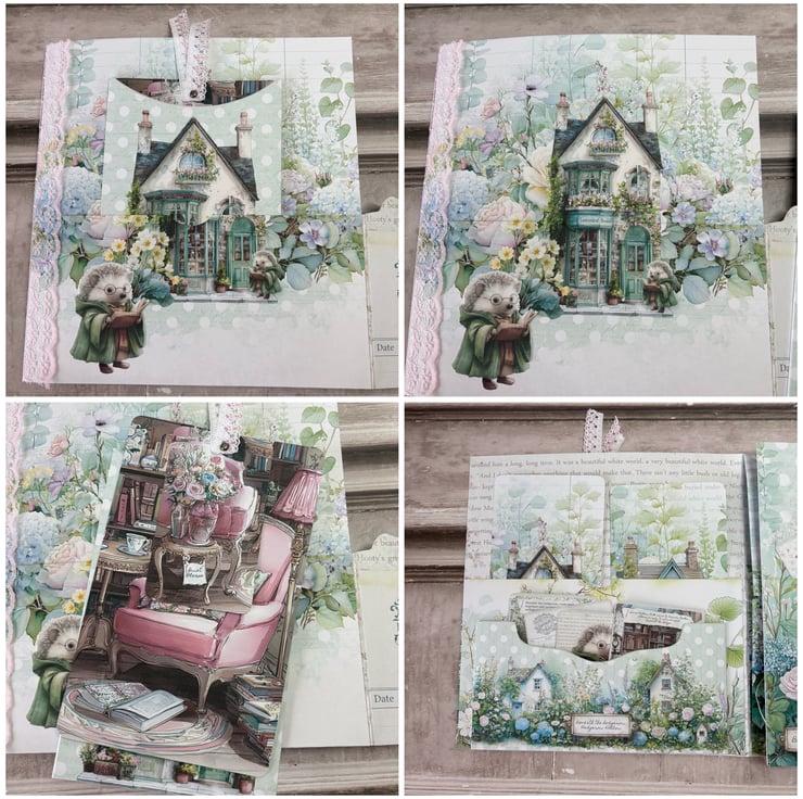 Measuring a perfect 8.25" x 7.75", this delightful folio has 11 pockets with 18 journalling cards and 4 large tags/bookmarks. Every turn of the page is a wonder, imaging the little animals living in Hedgerow Hollow, popping to the library, over to a neighbour for a cup tea. The middle section holds a pretty journal with 84 pages, plain pink, pale green and patterned pages. Tucked in a hidden pocket and closed with 2 flaps. Outer edges edged with pale pink lace. Visit Blossom Burrow, Bramble Bend, Lantern Lane and Bramblewick Burrow.