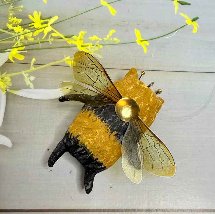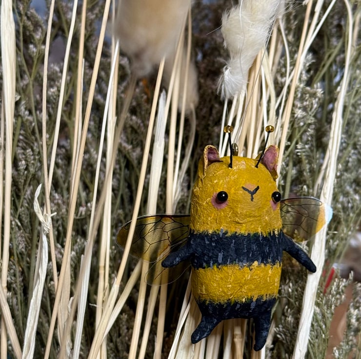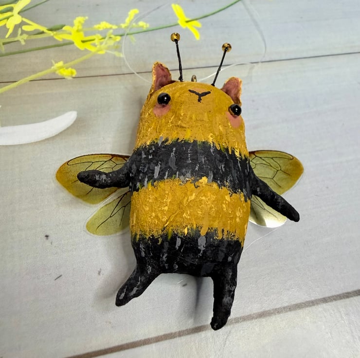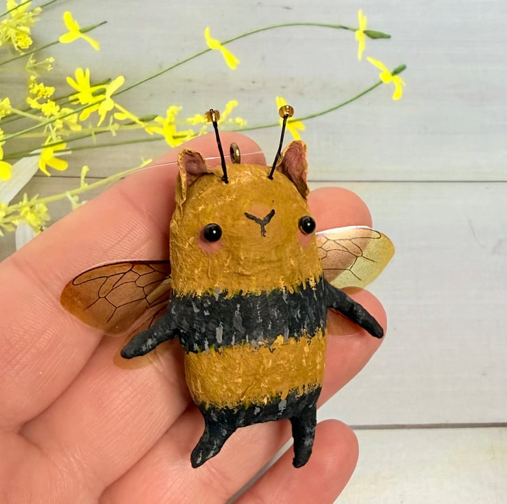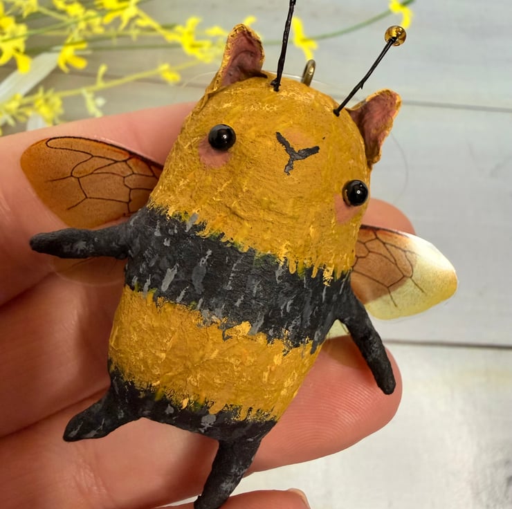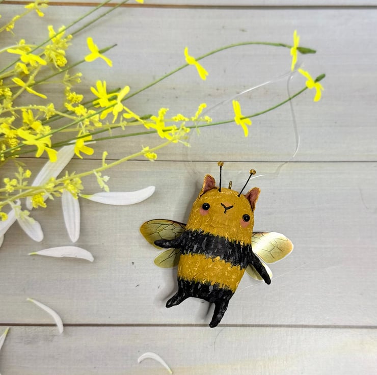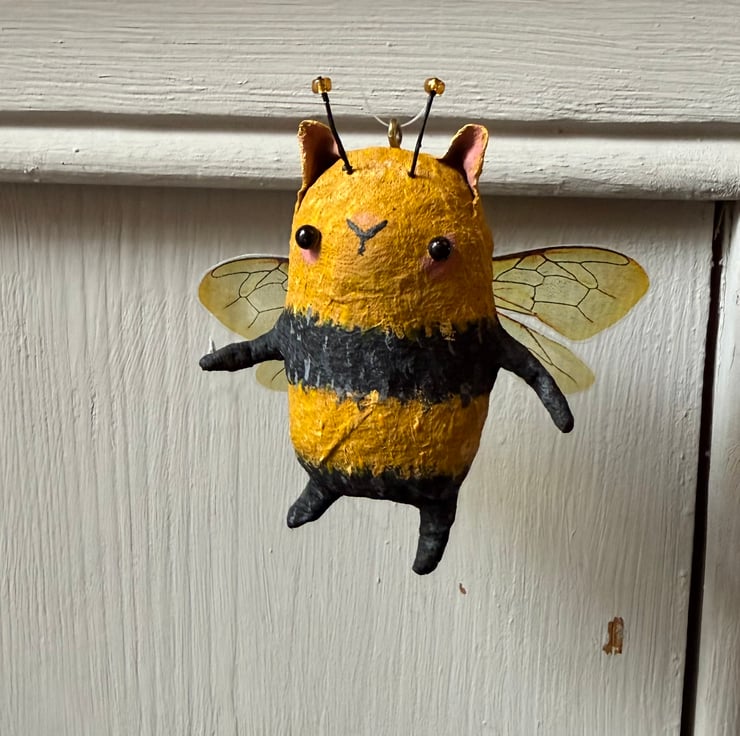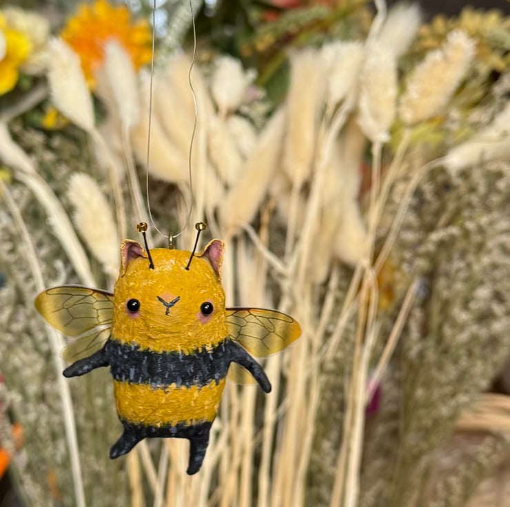 Small spun cotton bee cat with wire frame and printed plastic wings. Kitty bee is completely hand painted. Kitty bee has bead topped wire antenna and glass bead eyes. Wings are attached with push pin. Kitty bee has transparent loop hanger and measures roughly 6.5cm tall with a 6.5cm wingspan. This is for decorative purposes only and not a toy. Gift wrapped and sent in recycled or recyclable packaging