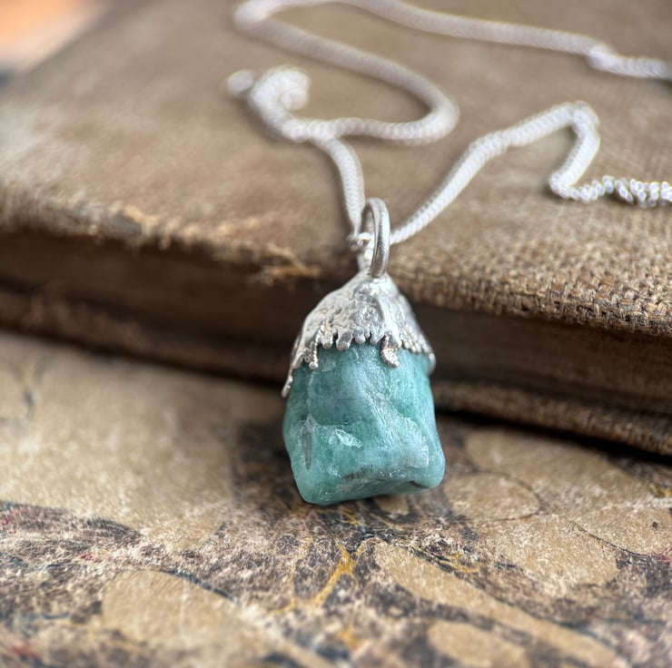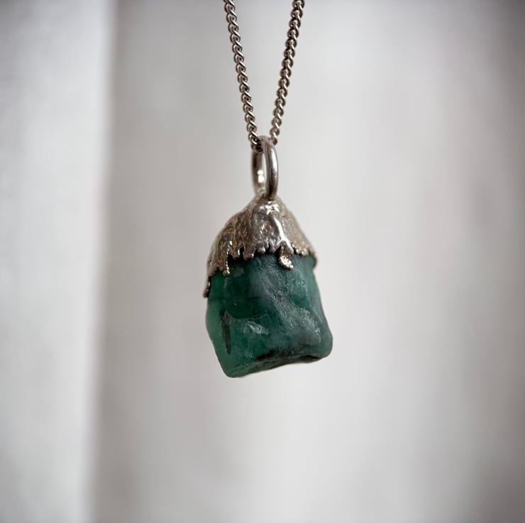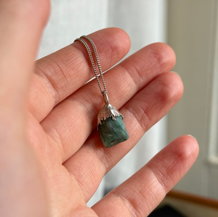 A one of a kind rough emerald necklace. Made with a large natural opaque emerald stone set in a freeform, organic silver setting.